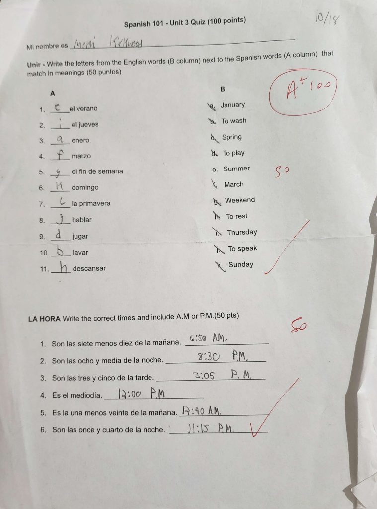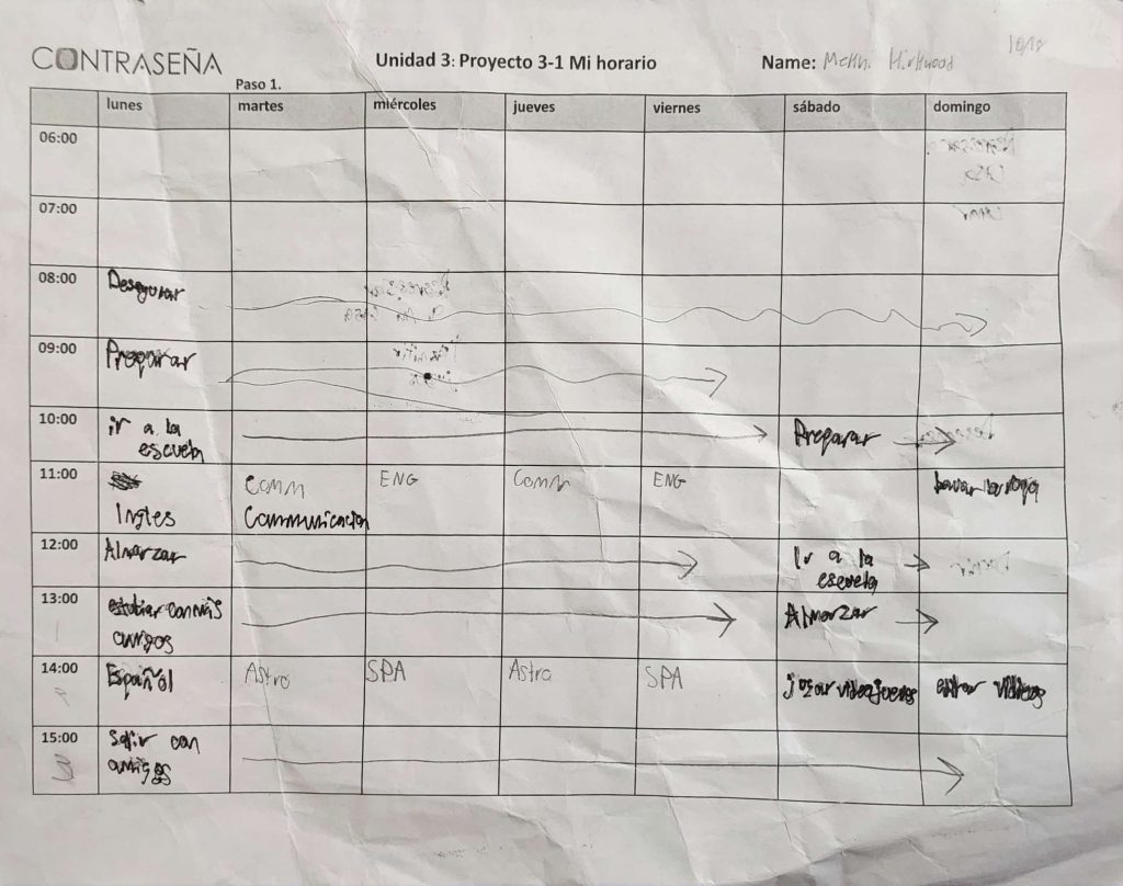 My Spanish class is on Mondays, Wednesdays, and Fridays at 2 in the afternoon. In the Spanish class, we have to speak in Spanish. We write and read in Spanish, as well as practice speaking it. We studied the conjugation of verbs, as well as the verbs themselves and when to use them. Another thing we did was learn about the times of the day, days of the week, months in the year, and the seasons. We also learned about vocabulary such as where things are, how we feel, and how we are. Below are some of the projects that we did in Spanish 101