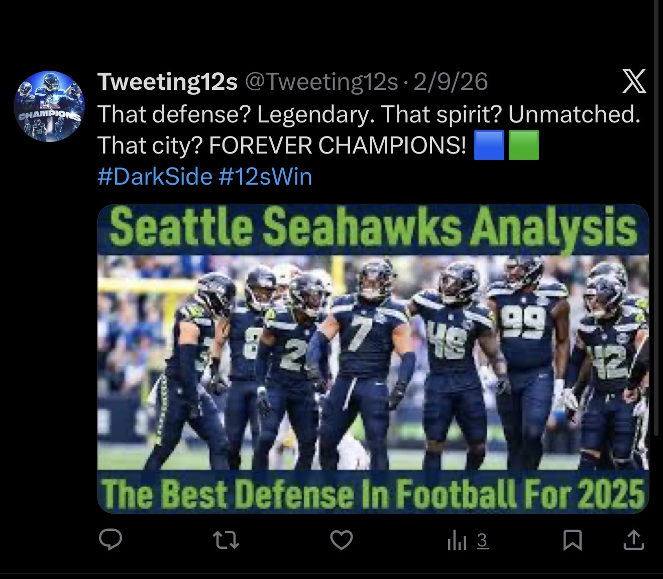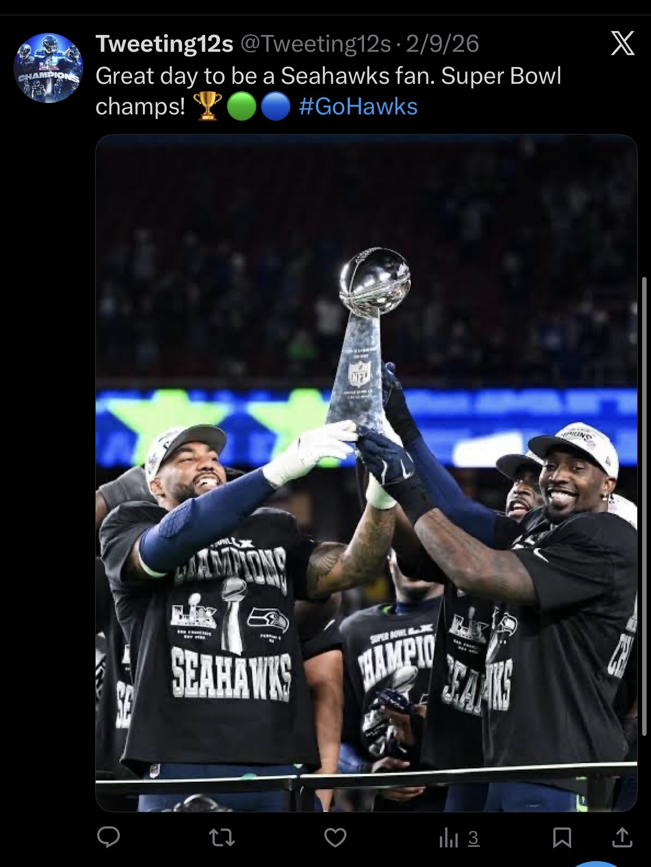As shown within the picture provided I wanted to reiterate that we are the Super Bowl Champions of the 2025 NFL Season. Just a simple reminder to the people that may not have watched the game. Also emphasizing that it is a great day, finally someone different other than the usual teams took the Lombardi home. This is only Seattle’s second Super Bowl being that this is the revenge tour of our last Super Bowl Appearance against the Patriots coming out on top this time. Especially under new coaching.