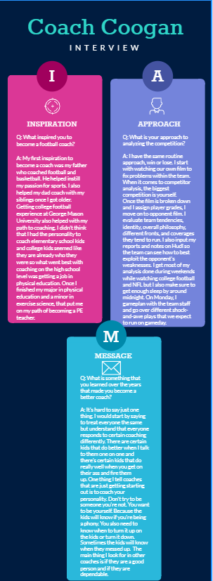 My interview was with Coach Tim Coogan, head football coach of Falls Church high school in Fairfax County, Virginia. I asked him three questions over the phone to get more insight about how he got into coaching as well as how he prepares for the competition. He provided useful information during the interview that aspiring coaches can take to become better leaders.