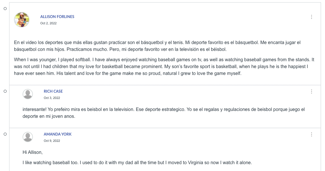 My first conversation speaking with an individual abroad I entered the meeting very nervously. After speaking for what seemed to be a couple of minutes, 15 minutes had flown by. Speaking with a Spanish speaking individual can be intimidating but the consistent practice we received through verbal submissions on LingroLearning as well as, verbal FlipGrid assignments throughout the semester helped my studies immensely leading up to the final discussion abroad, easing my nerves, and allowed for anxiety free conversation. Not always knowing each work being spoken I have learned to pick up on contextual information, responding and asking questions regarding the words I do understand. This usually allows me to understand a majority of what is being spoken to me in Spanish, something I could not say at the beginning of the semester.