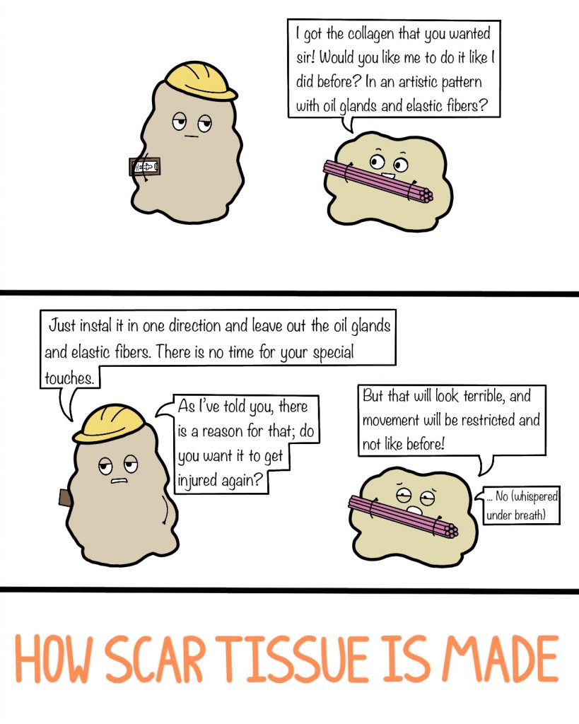 I chose this meme because I found it funny, and it taught me something new. I now know why scar tissue is different from normal tissue, which is because they don’t have oil glands or elastic fibers.