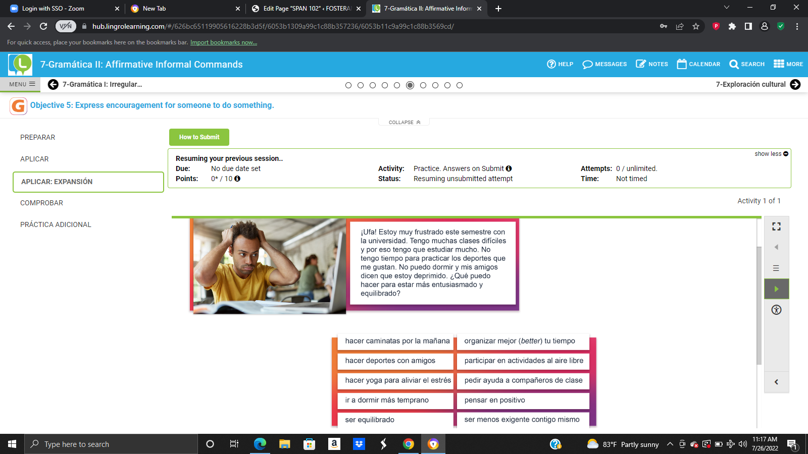 In our text book, Lingrolearning we were giving texts or passages and or menu where we had to interpret based on the chapter or topics we were on. Being that I am just learning the language it was difficult in some cases but fun at the same time. I have provided three screenshots of some reading that I had to do. The first one was basically a college student who was frustrated because the semester was difficult and he had a lot of classes so he had to study a lot and could not participated in sports. These were written in Spanish and you had to interpreted what the passage was talking about. the second screenshot was a passage where you had to skimmed through and identify the correct words that they asked. this a perfect example of using context clues because even though you might not know every words in the passage context clues could help.