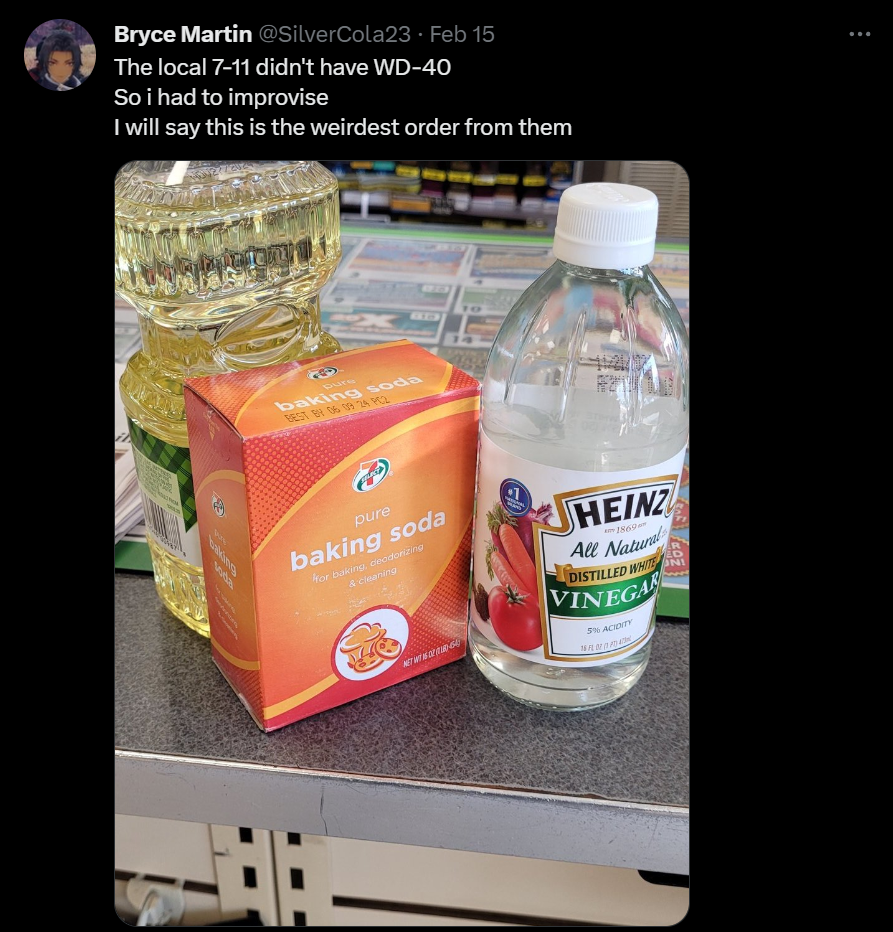 After going to 7-11 I found out that they did not have WD-40, but because I didn’t want to give up I wanted to see what I can use as an alternative. After looking online I found that you can use white vinegar and baking soda to take care of the rust