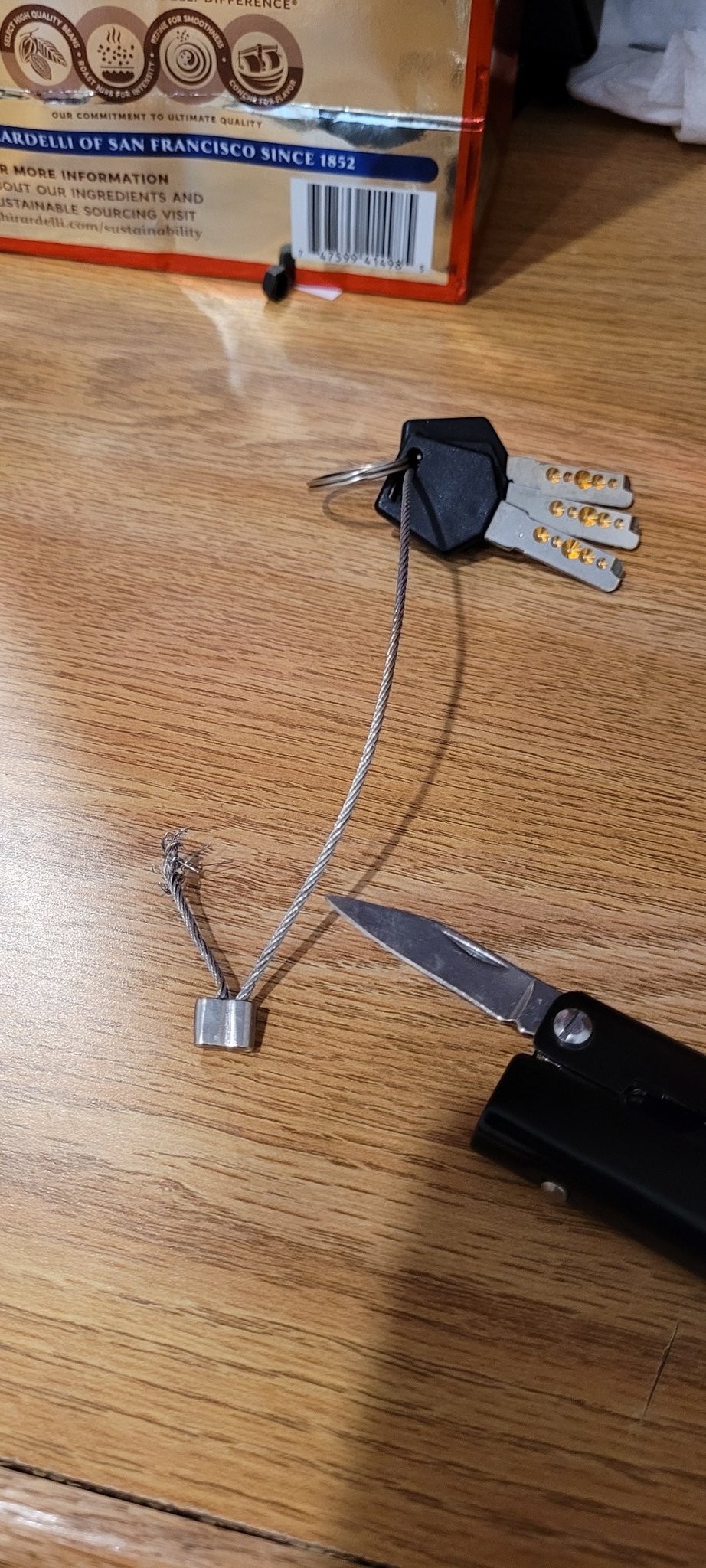 After cutting the pieces one by one for an hour I managed to get through the wire and retrieve the keys to the lock.