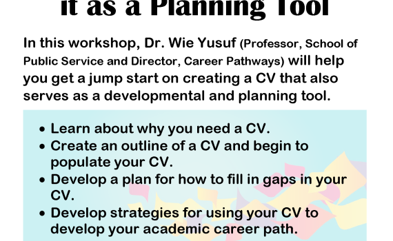 Creating Your CV and Using it as a Planning Tool In this workshop, Dr. Wie Yusuf (Professor, School of Public Service and Director, Career Pathways) helps you get a jump start on creating a CV that also serves as a developmental and planning tool. Friday, October 17, 2025 from 11am-12pm […]