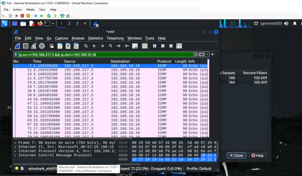 a. Apply proper display or capture filter on Internal Kali VM to show active ICMP traffic.