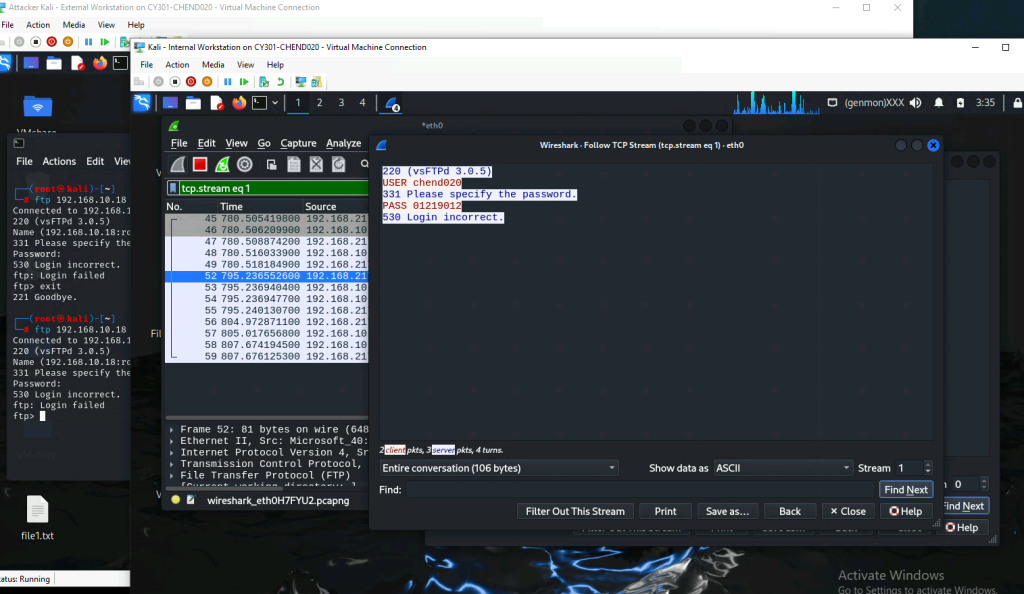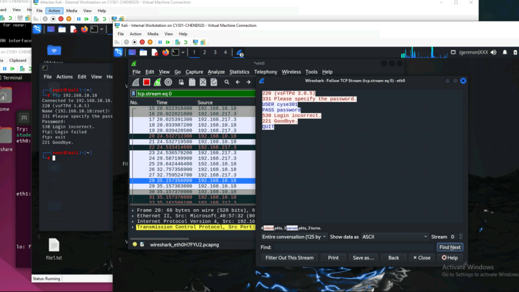 To find this information, I followed the packets until I saw the packets that had codes like 210,230, and 331 which were codes also shown when attempting to gain access to the FTP server. Then I noticed the “Hidden segment” packet that was under the request password. I right clicked that packet then went to follow and clicked the option for the TCP stream which then showed me the entire interaction between the connection of the external Kali machine and the FTP server of the Ubuntu machine.