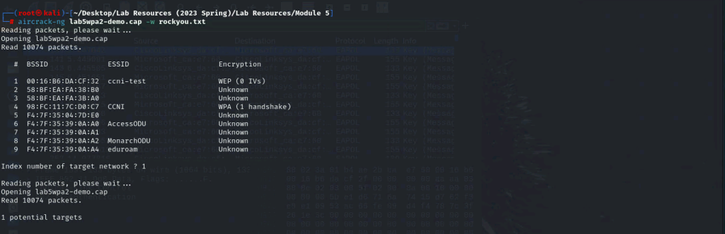 • The above files are zipped in a folder named “Lab Resources (2023 Spring).” You can locate the zipped folder in your VMshare in any Kali Linux VM. Then, extract the zipped file and find the assigned WPA file under the sub-folder