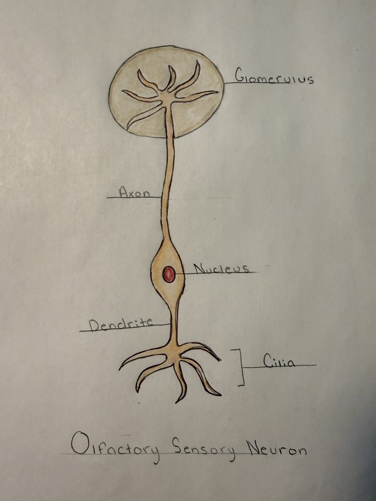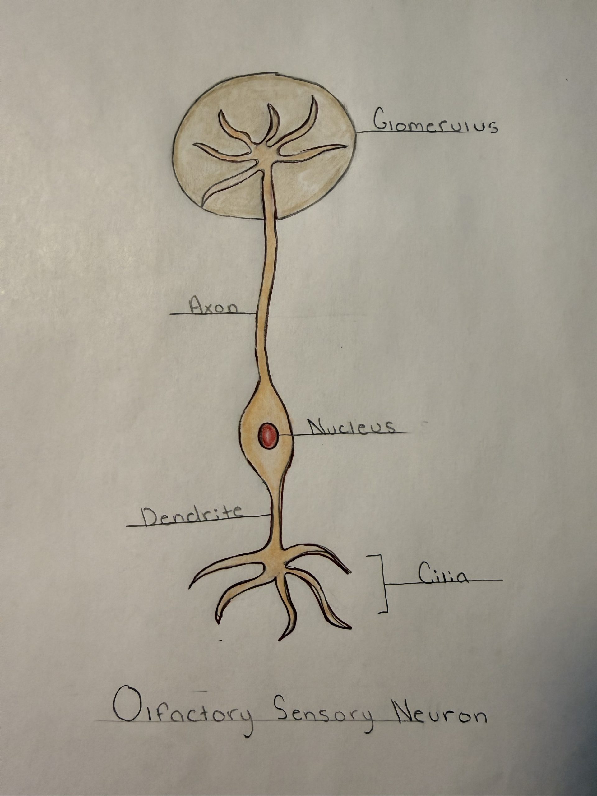 The cell type that I chose to draw is called a neuron, more specifically, an olfactory sensory neuron. While the picture I drew only shows a unicellular neuron, it is actually a part of a multicellular system for animals called the olfactory system. This system of neurons allows an animal to detect important smells, signaling their brain on what to do next. This plays a very important role in an animal’s survival because it’s how they differentiate predators from prey. This is important to my field because of how the olfactory system can affect animals behaviorally while hunting or even sleeping. It can cause them to be sneaky or even wake up from smelling a nearby threat. Overall, the olfactory sensory neuron plays a big part in an animal’s way of living.