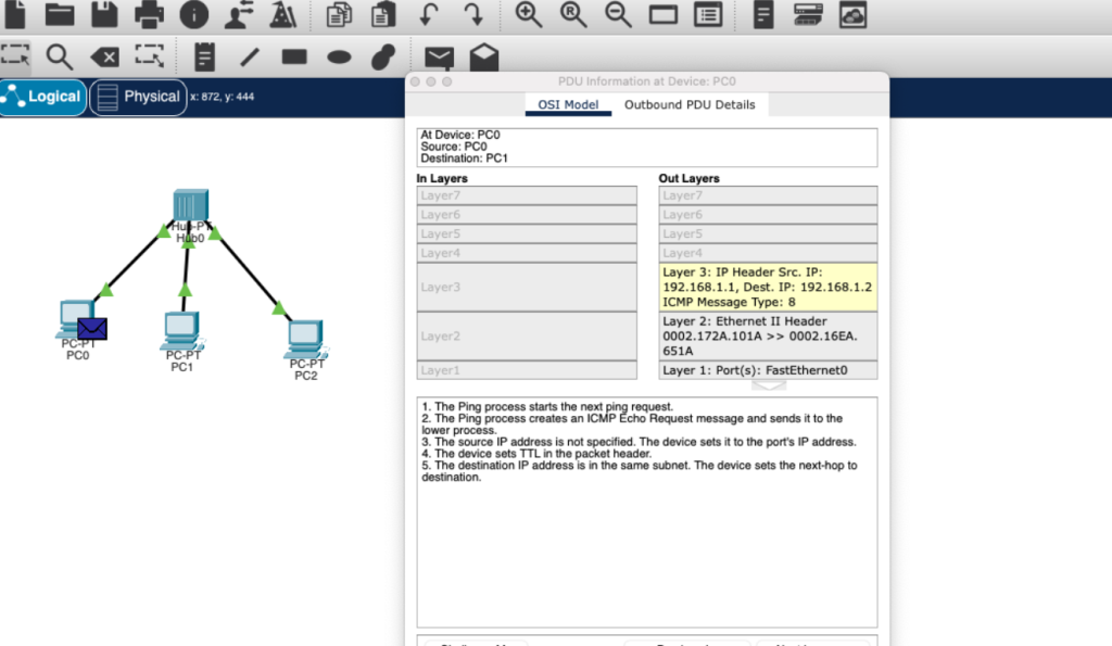 Set up a small LAN using three PCs connected through a hub and used Packet Tracer’s PDU/OSI tool to trace an ICMP ping between devices.