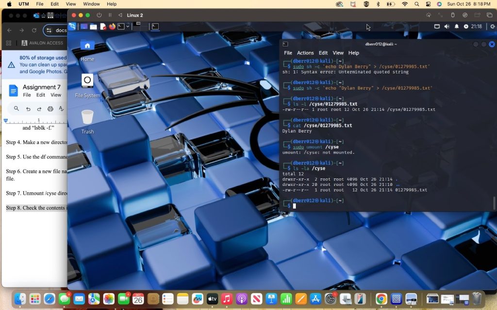 Step 6. Create a new file named for 01279985.txt in the directory /cyse and put your name in that file.