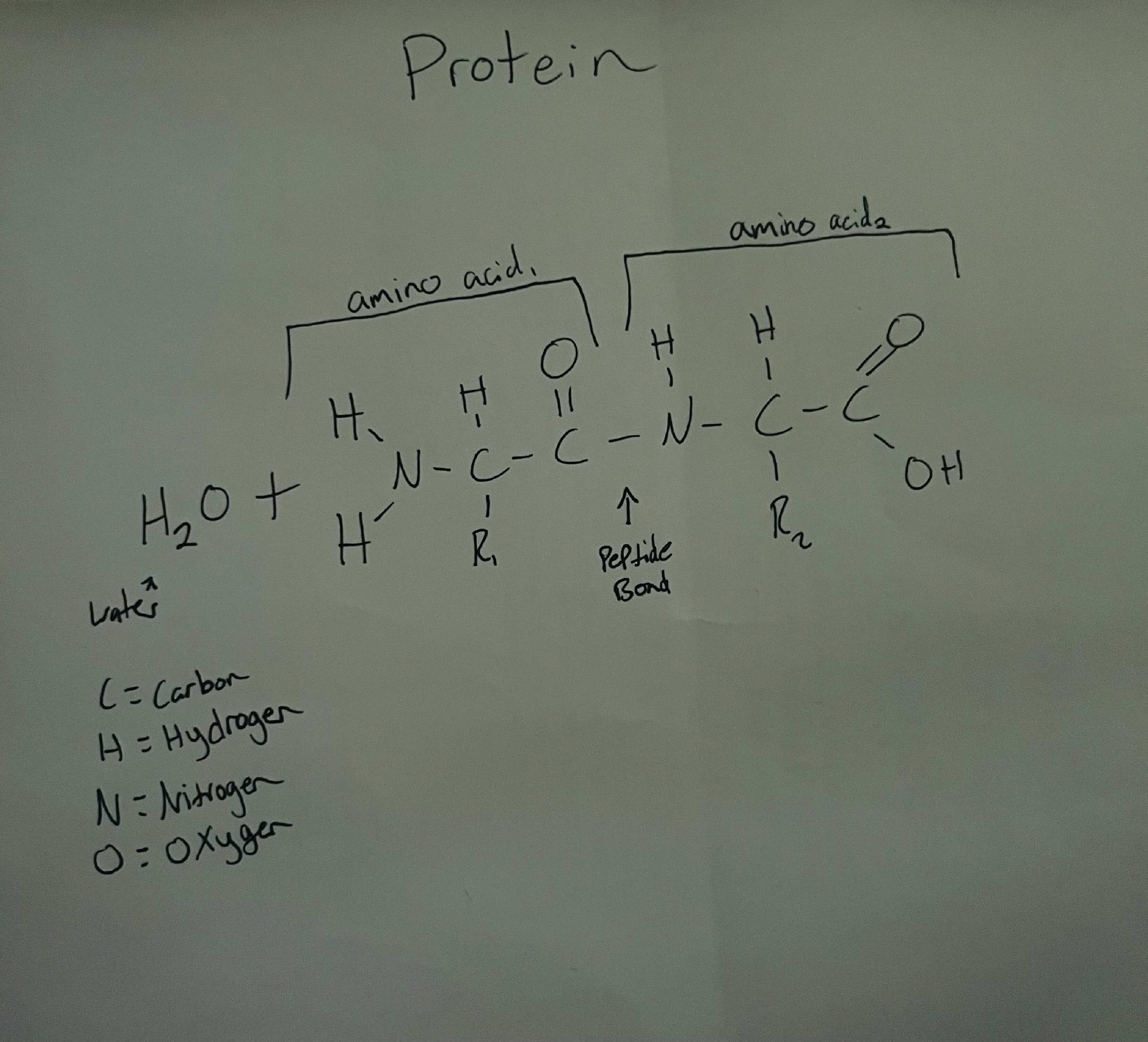 The image below shows a protein built from two amino acid monomers which creates a condensation reaction to form a peptide bond with the release of a water molecule.