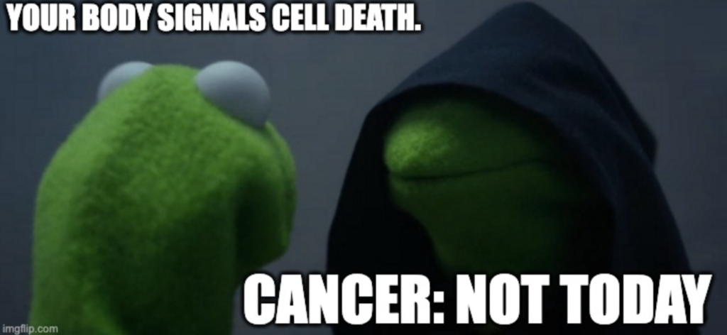 I created a meme using Imgflip, which is a meme-generating website. My favorite type of humor is dark. I choose to make a meme about cell death and cancer. Cancer is the abnormal growth of cells. The body should naturally eliminate old, abnormal, or malfunctioning cells. Cancer occurs over a period of time, where cells regenerate with harmful DNA; your body can no longer recognize the signal to trigger cell death. My meme is Kermit the Frog, representing your body signalling cell death, and evil Kermit, representing cancer. I really hope you enjoy and get a little chuckle out of it.