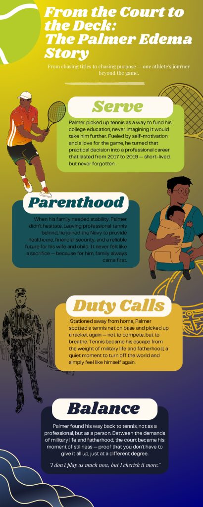 Palmer is a former professional tennis player who competed from 2017 to 2019 before making the decision to enlist in the Navy to provide financial stability and healthcare for his family. Through our conversation, it became clear that his journey was never defined by what he gave up, but rather by what he chose to protect.