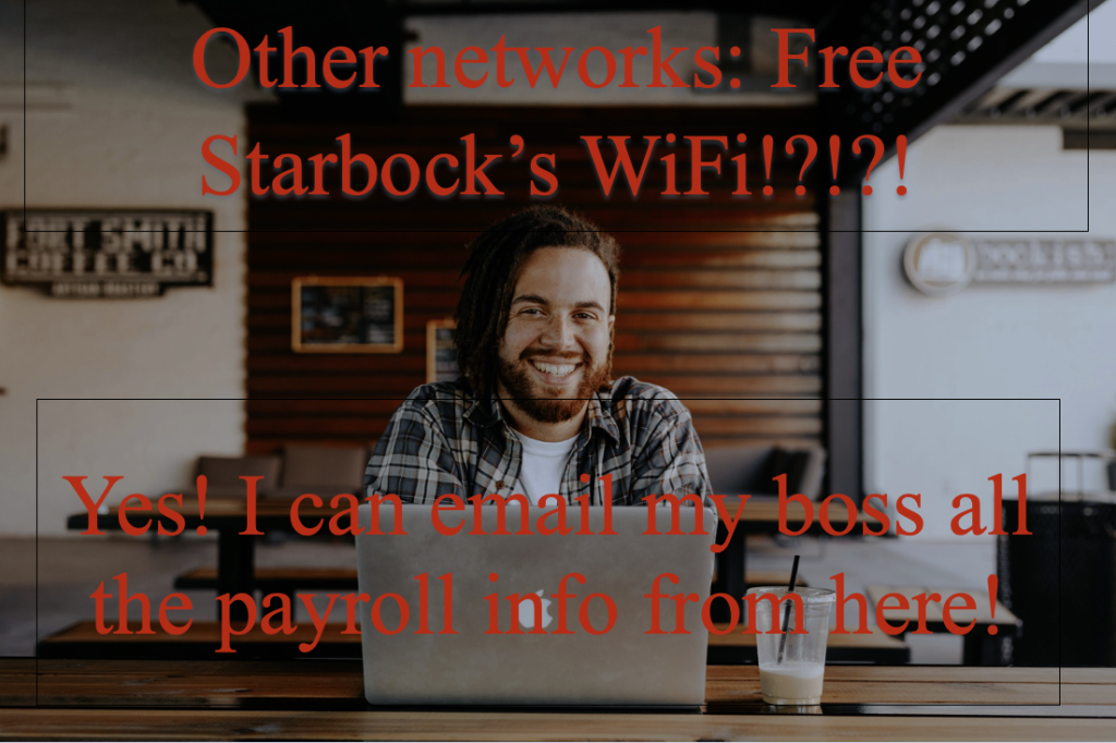 In the image above, our subject is possibly shown in a coffee shop enjoying a beverage and working on his laptop. A common problem associated with mobile computing, or remote-work scenarios is the use of unknown Wi-Fi networks. In this meme, I’m making what could pass for a mildly humorous attempt to illustrate that bad-actors frequent public places to set up honeypot-type free internet access. With these bait access-points, criminals can hijack myriad data from unsuspecting users with the potential of catastrophic damage to a company’s vital data.