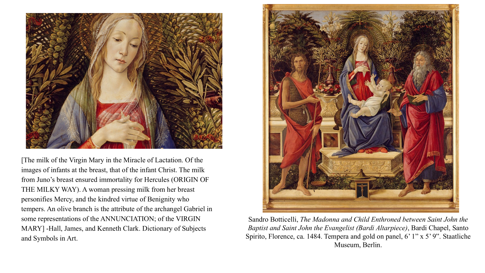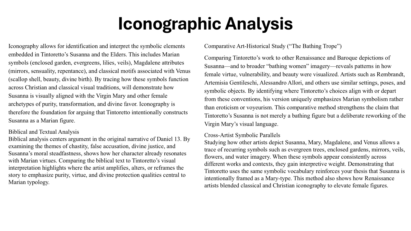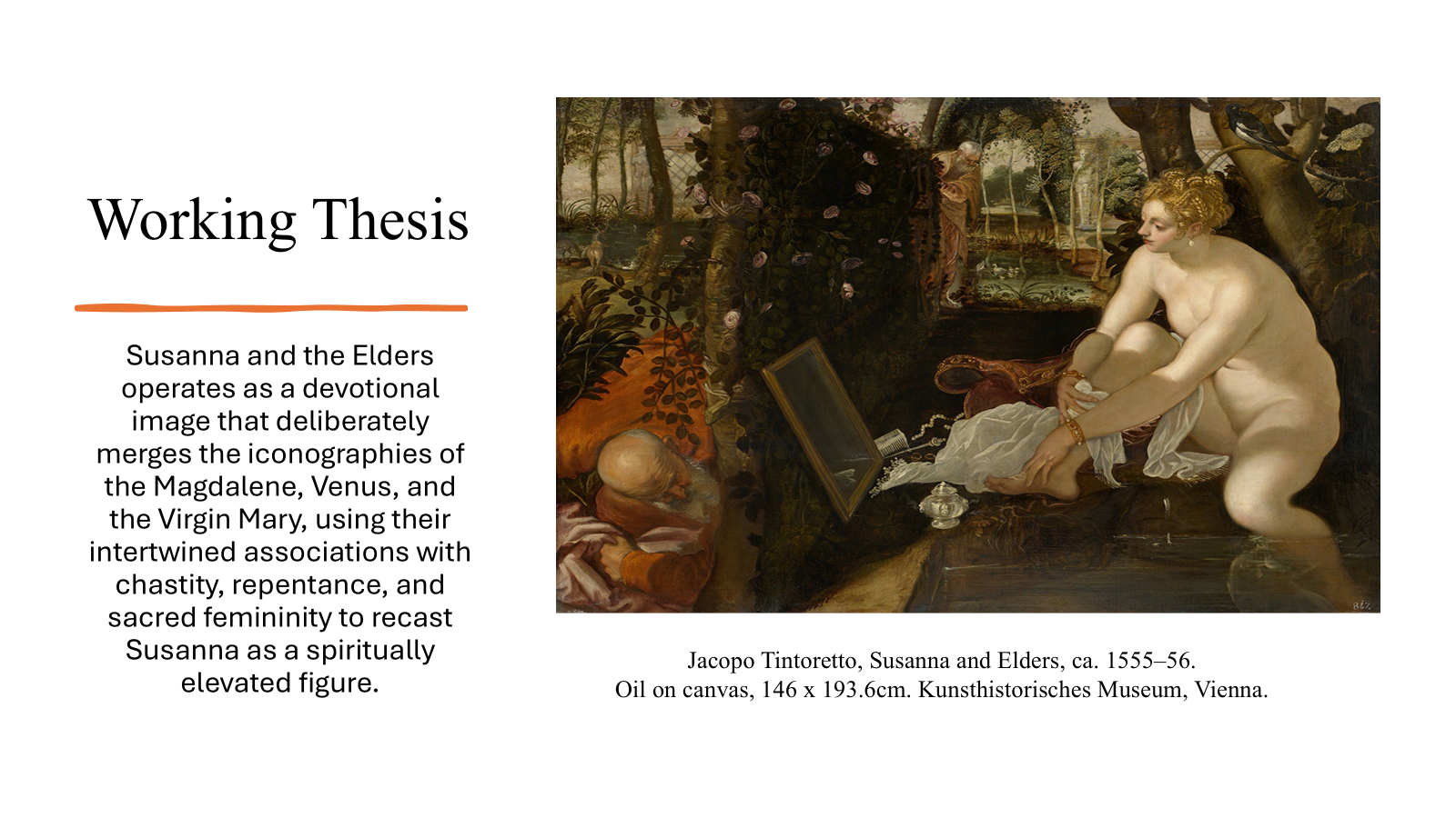 4. They not directly address Tintoretto’s Susanna, but their discussions of iconographic symbolism provide strong support for linking Susanna to Mary, Mary Magdalene, and Venus. They offer multiple iterations of symbols such as evergreens, enclosed gardens, mirrors, and flowers that reinforce my thesis of Susanna as a Marian type.
