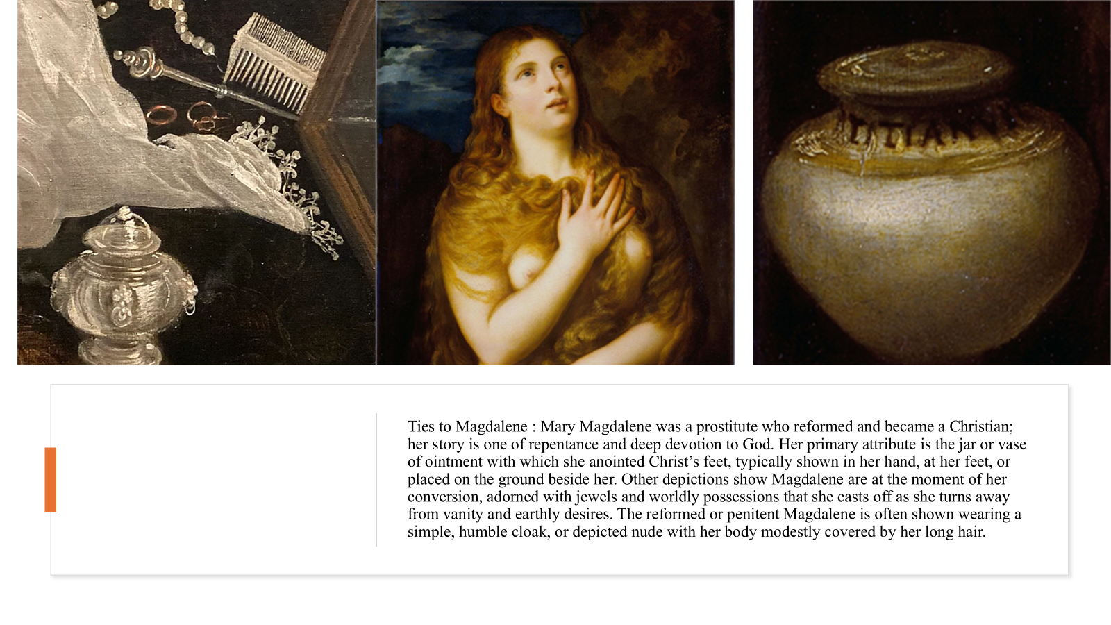 The painting takes on a Marian inflection, placing the viewer in a continual inner dialogue about themselves and the state of their own faith. The scene contains iconographical evidence that supports the idea of Susanna functioning as a version of the Virgin Mary. Symbolic references also point to Mary Magdalene, who represents repentance and spiritual reformed to the goddess Venus, with whom the Virgin Mary was sometimes visually associated. As the Catholic Church elevated Mary to a near‑divine status, she accumulated titles such as “New Eve,” “Seat of Wisdom,” “Immaculate Virgin,” and Stella Maris (“Star of the Sea”). Iconography present in the painting ties Susanna to all three figures: the Virgin, the Magdalene, and Venus. During this era, the Virgin Mary was frequently depicted as a breastfeeding mother or shown with her breast exposed as she nursed the infant Christ. She is also associated with a thin white or sheer veil, roses and lilies, and symbolic trees such as olive, cedar, palm, and evergreen. Several of these symbols appear in the enclosed garden another Marian symbol where Susanna bathes. Mary Magdalene, once a prostitute who reformed and devoted herself to God, also has attributes present in the garden. Venus, the goddess of fertility, love, and beauty, was born from the sea and rose from a scalloped shell; her myth begins with an immaculate conception, paralleling Mary’s divine conception. Some of Venus’s symbols also appear in the painting. By 1555, when this work was created, Tintoretto was known for his self‑portraits and religious subjects, and his connections to Michelangelo and Titian are visible in elements of the composition. Evident in the painting’s sculptural forms.