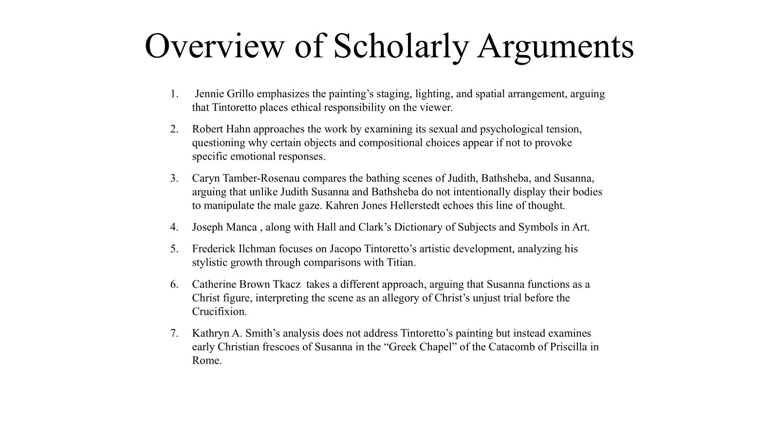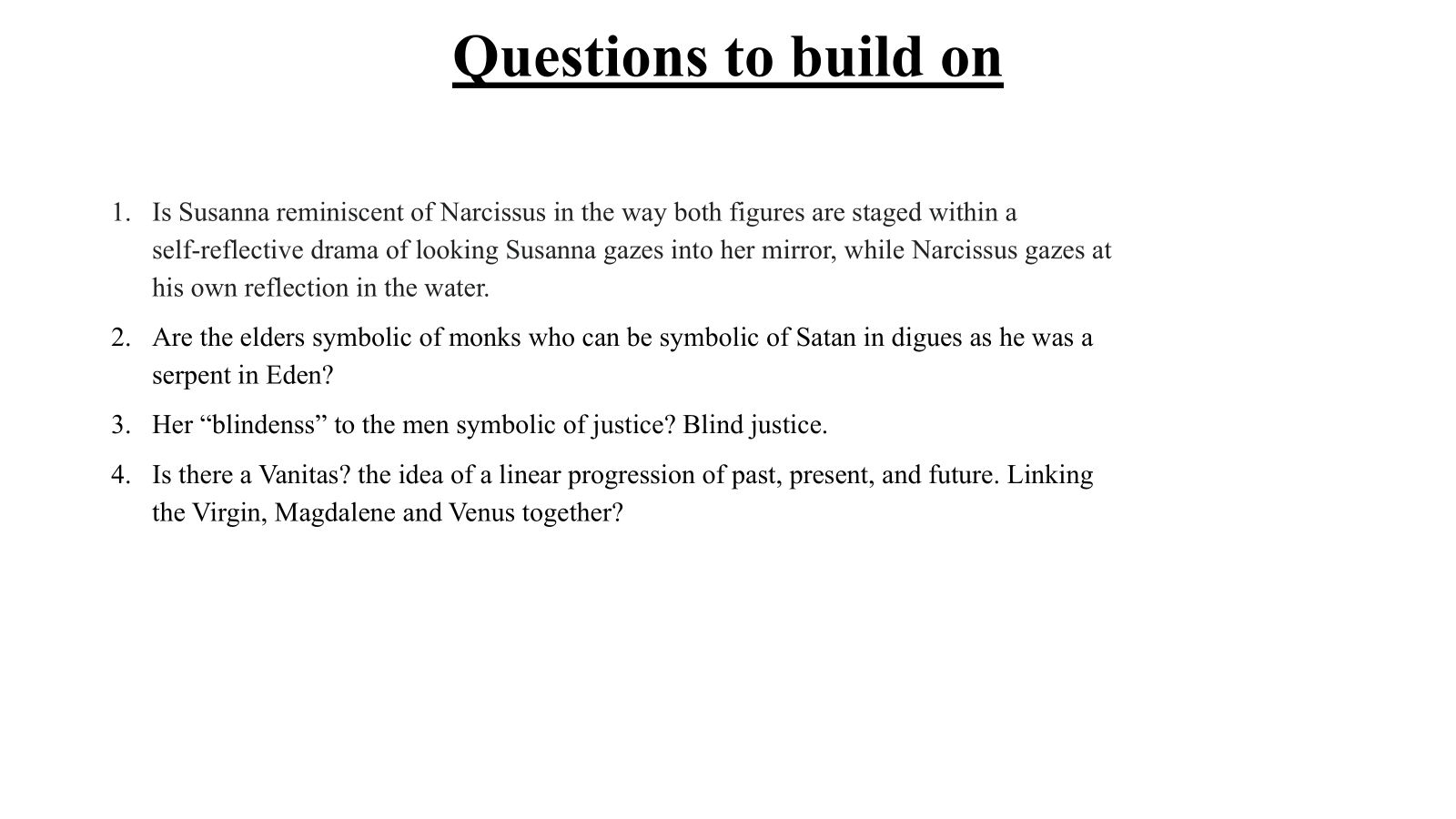 The sources I have gathered present these main lines of interpretation. Several scholars read Susanna and the Elders through a theatrical and moral lens, sexual/voyeuristic. New ideas explore Susanna as Christ, the importance of chastity/virginity over marriage, and common attributes between Magdalene, The Virgin, and Venus. Introduces other bathing scenes.