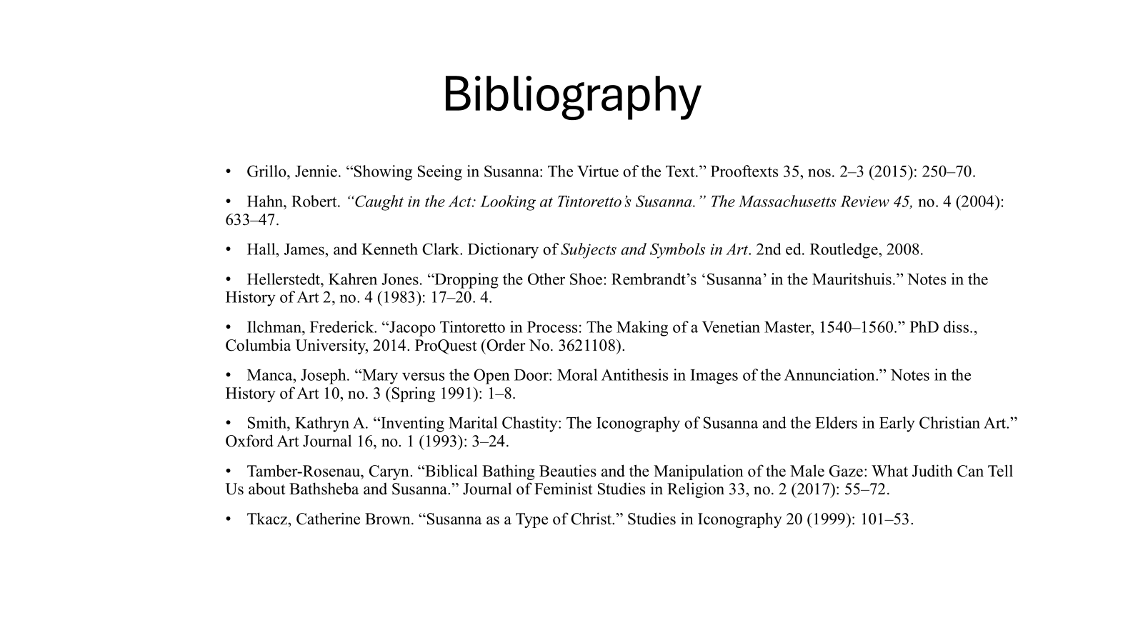 Hahn, Robert. “Caught in the Act: Looking at Tintoretto’s Susanna.” The Massachusetts Review 45, no. 4 (2004): 633–47