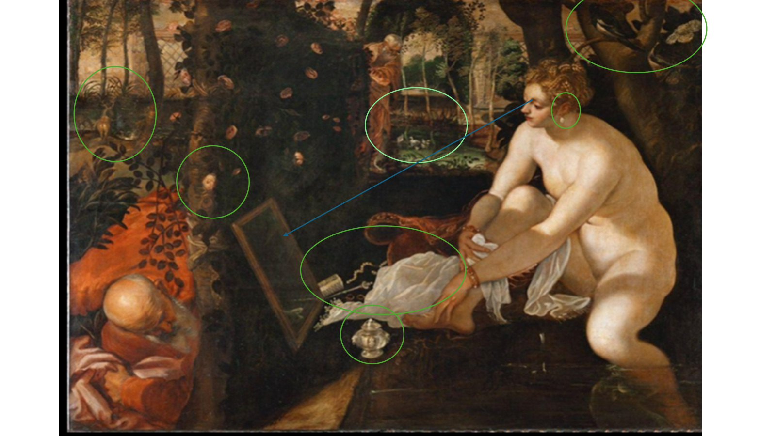 My thoughts: To form an opinion about the painting, I need to understand what inspired its concept. Knowing the artist’s ideas or motivations can help decode its symbolism. Like all compelling art, Susanna and the Elders is not simply a depiction of a scene, it is filled with symbolic imagery and connected to the social or political climate of the Scuola di San Marco at that time. The Vulgate, a religious text, will be important; Daniel chapter 13 will certainly feature in my final paper as it sets the scene for these events.