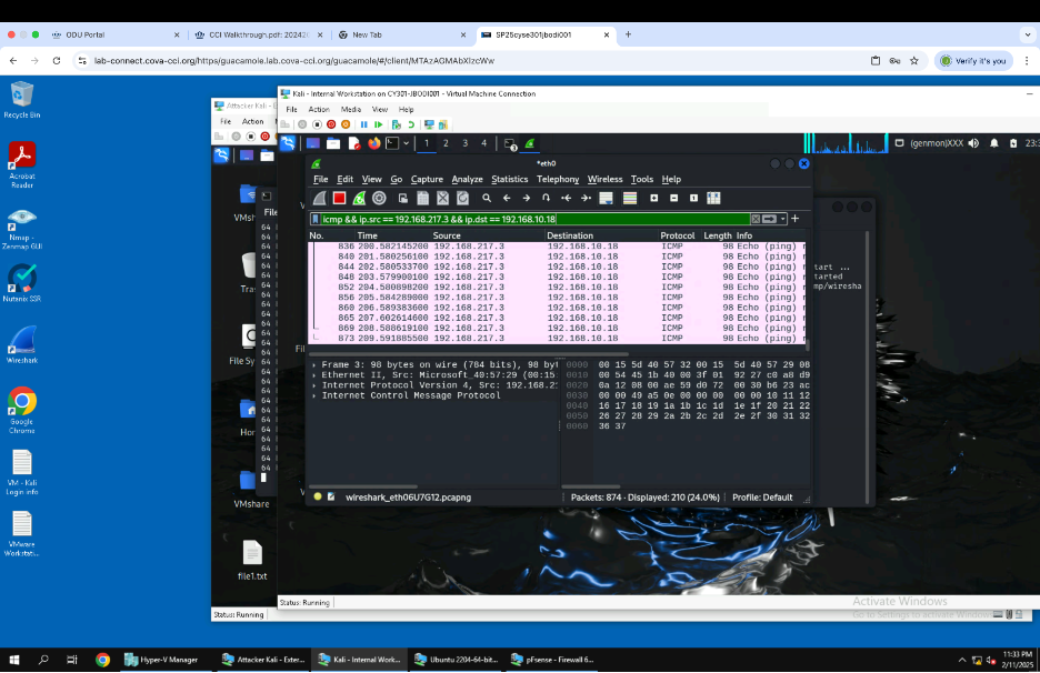 This artifact demonstrates my ability to analyze network traffic and investigate communications between systems. The assignment required using packet-analysis tools such as Wireshark to capture and filter network traffic between multiple virtual machines. By applying specific filters, I was able to isolate ICMP and FTP traffic and observe how data moved across the network.