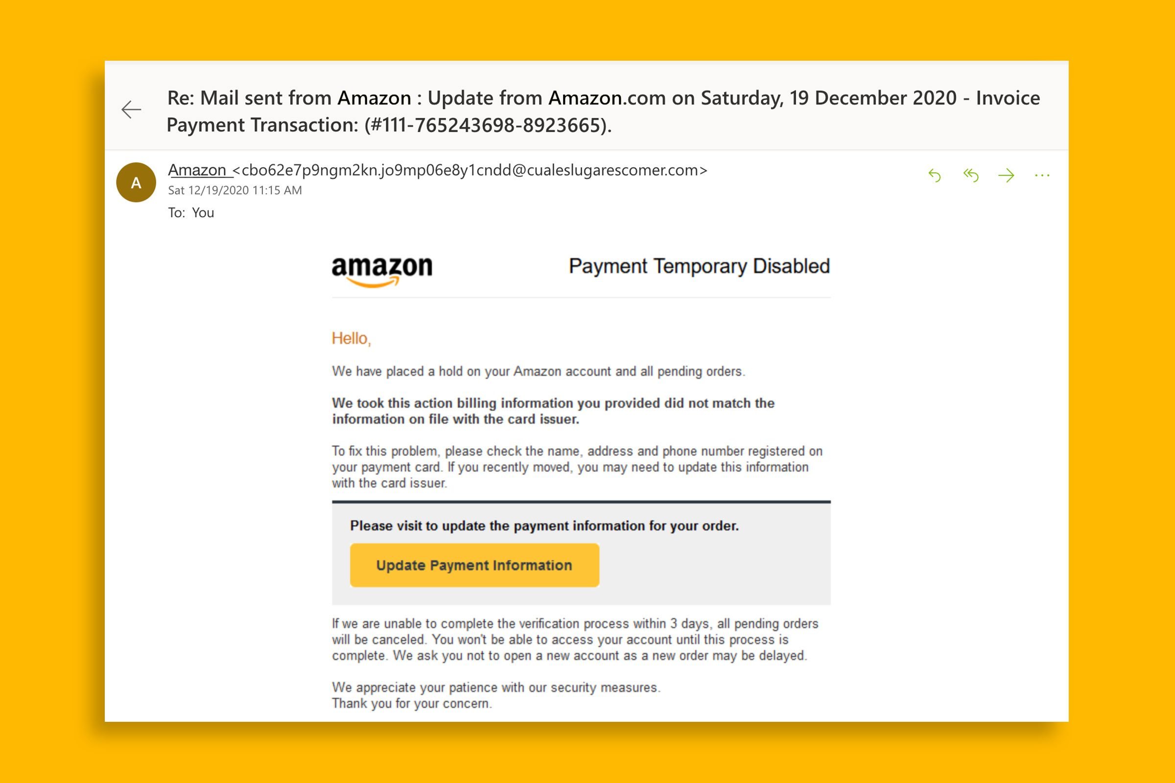 The first image shows a fake Amazon payment alert email, which is a common phishing tactic used to trick users into clicking malicious links or providing personal information. This highlights how attackers exploit familiar brands and social trust rather than technical vulnerabilities.