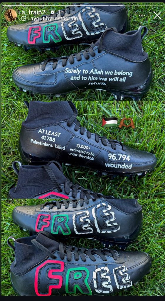 The activism gesture I want to focus on was very clear to me the moment I read the description for this assignment, and it is a gesture that has spoken to me since I initially saw it. The gesture I am talking about is Texans linebacker Azeez Al-Shaair’s “Stop The Genocide” message written on his eyeblack, bringing attention to the ongoing genocide in Gaza City, Palestine. This is a difficult topic for most people to discuss, and I find it admirable that he had the courage to stand up for his beliefs in an organization that does not tend to look fondly on those who do so.