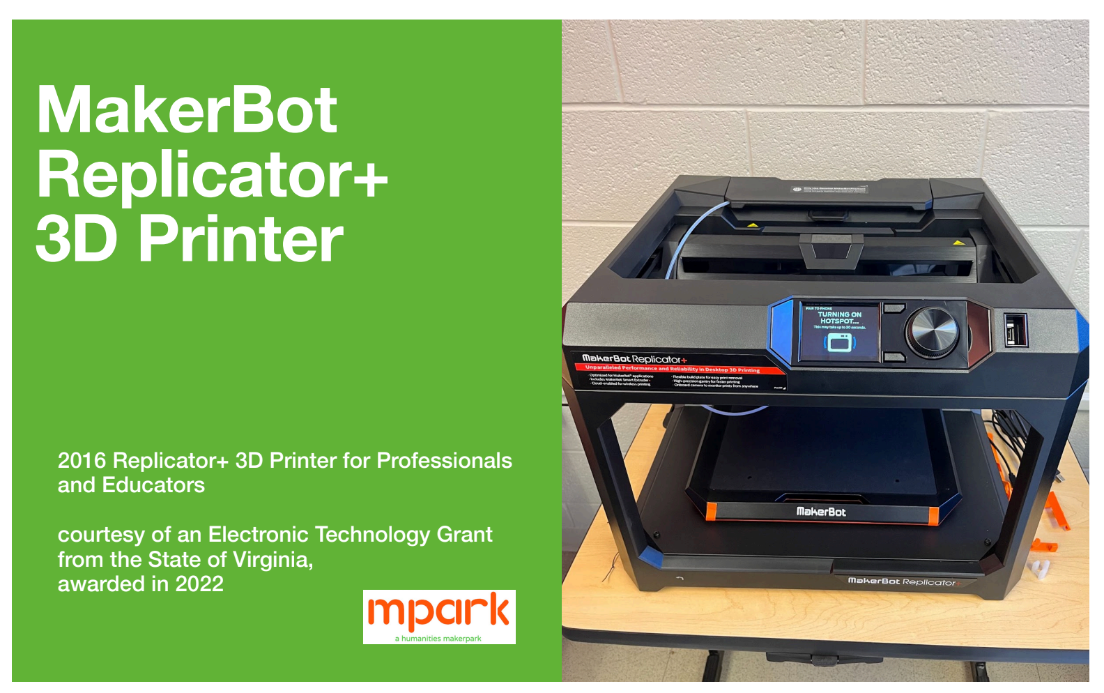 The MakerBot Replicator+ is mpark’s primary 3D printer for rapid prototyping and creative projects. It prints using polylactic acid (PLA) filament and supports cloud-based file submission. We welcome you to submit your models through our printing portal, which connects directly to the mpark 3D printer. Staff assistance is available if needed.