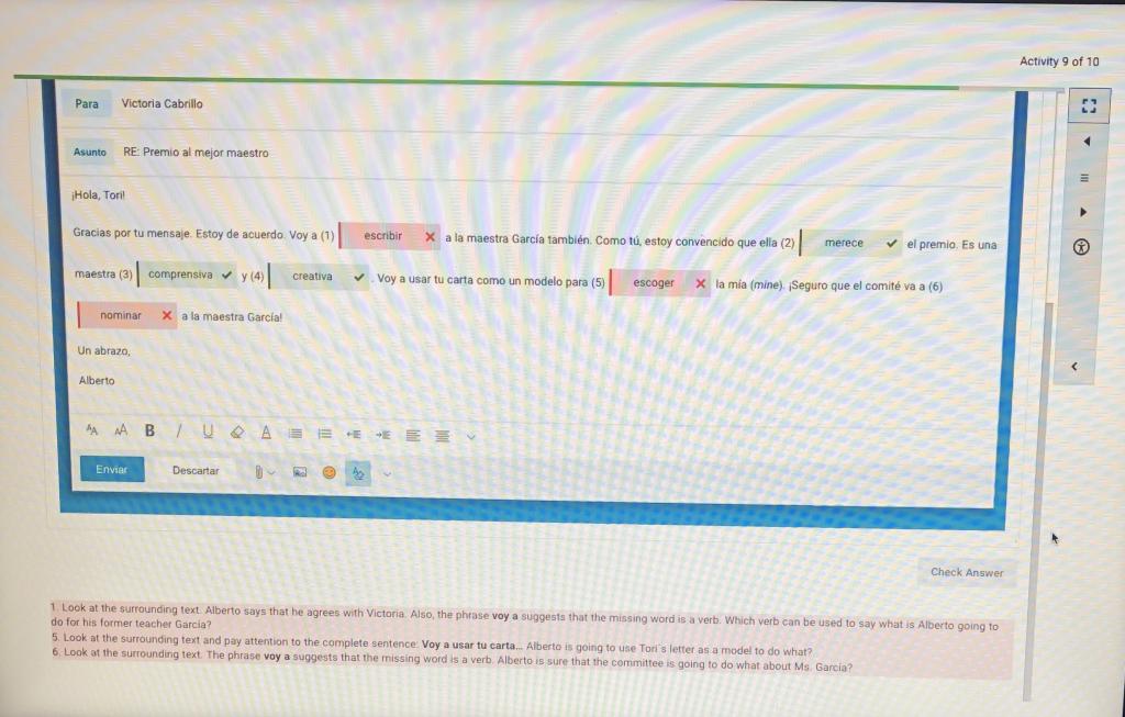 The majority of the reading that I had to do in this class was during Lingro-learning quizzes. There were many quizzes that involve a word blank or sentences that would have to be filled in myself and also conjugates in any way necessary. These quizzes were very difficult for me. The word bank part was easier but I struggled with the conjugations. Being able to read a paragraph and figured out what is going on was very challenged when new to the language. Thes quizzes taught me the importance of knowing the conjugations and understanding when to use them.