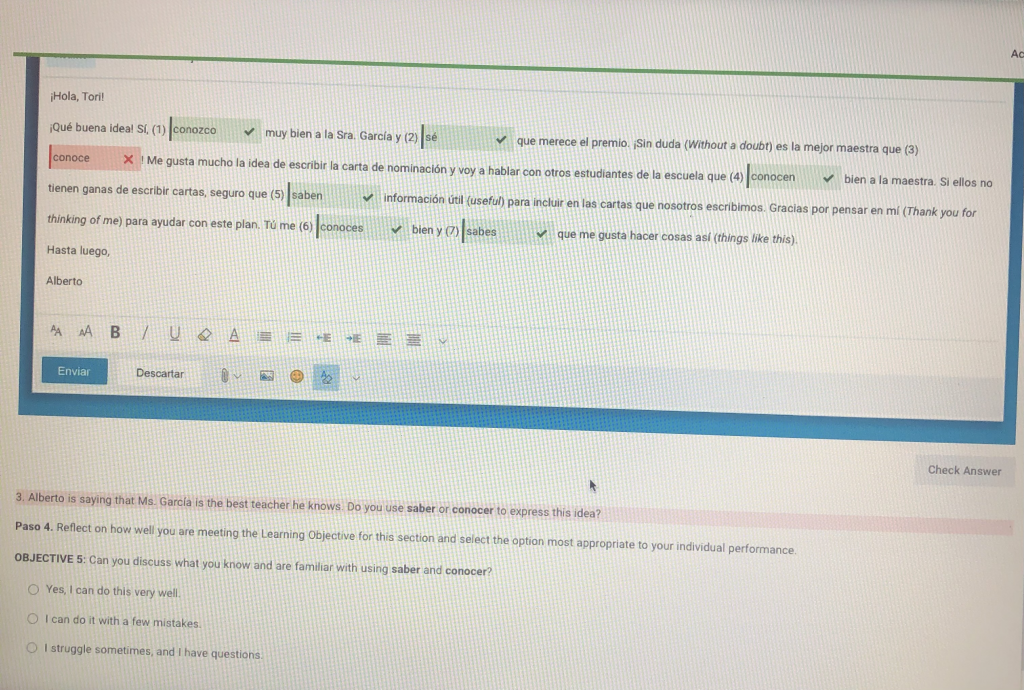 This project was really intimidating to me at the very beginning because discussion board posts have always been short and simple. But when we were asked to write a formal letter and it will have to be 100-150 words, I was discouraged. I have never written 100 words that have to be in Spanish before. So when I decided to write, I planned on just starting writing and seeing how much I could write and I surprised myself by being able to write more than 100 words in my very first attempt. After going through the materials in Lingro-learning, I was able to get more ideas to include in my letter.