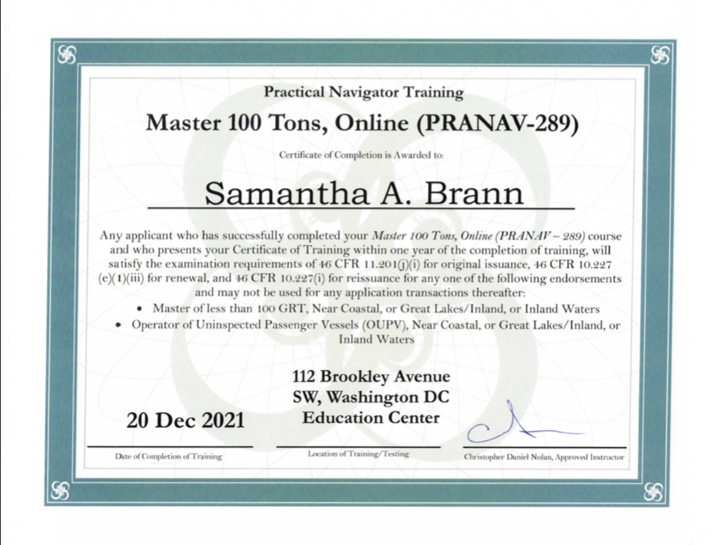 This certificate was earned through my two years stationed overseas in Guam on a Coast Guard vessel. It recognizes my hard work and achievements throughout the time served overseas.This certificate documents my skills and knowledge in the maritime industry. The document is more commonly known as “100-ton captains license” and allows me to operate a motor vessel weighing up to 100-tons with passengers for hire.