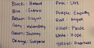 For this artifact I learned that I categorized colors very similarly to how I labelled them in terms of emotion. In the module specifically I learned that there is a difference in emotional expression based on culture but most emotions interpretation is universal which is likely the similarity in color categorization- most of which I aligned with. I chose to include my color categorization below.