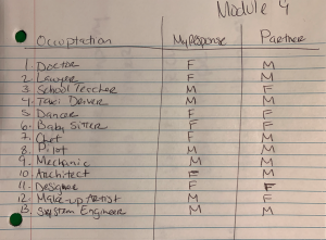 I found this Artifact engaging because I am especially interested in gender differences when it comes to perception and stereotypes. I learned from this activity that my partner thinks of more stereotypical roles than I do in some of the professions included. Some of the professions were similar but many different. I think being a woman I am more likely to envision women in certain roles and break the stereotype (though not always) and my partner, being a man, has the same tendency but these align more with stereotypes. I included the responses between my partner and I below.