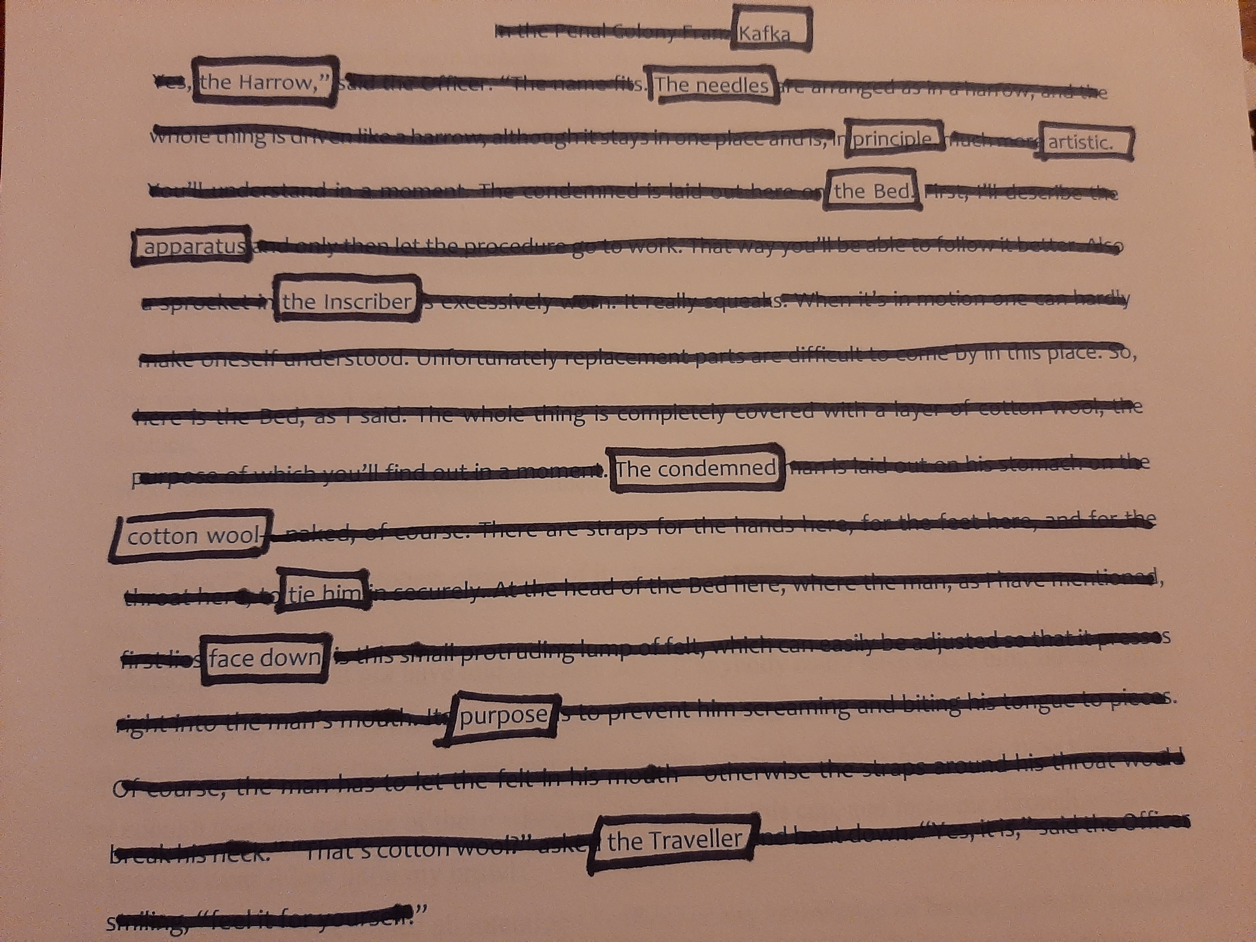 I want to try blackout poetry in a different way. Instead of making a poem from literature, I want to use this with my composition students when we discuss how to write an abstract or my public speaking students when we discuss how to create a keyword outline. Hopefully, using some of Kenneth Goldsmith’s ideas on “uncreative writing” will help cement the concept for my students and make this interface more visual! I wish we had done this TP sooner because my undergraduates could really use it!