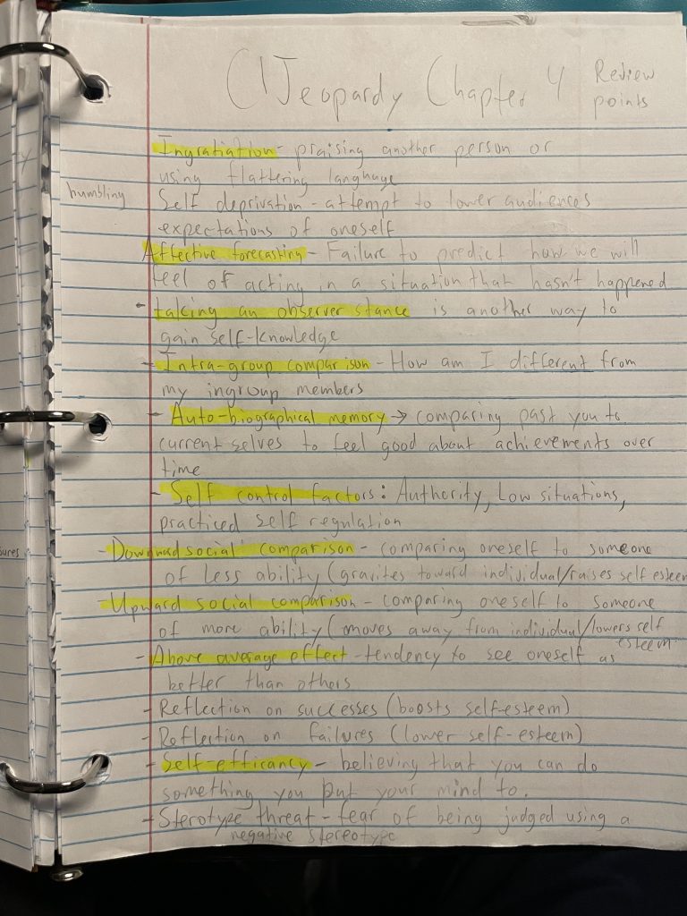 This is a picture of my Chapter 4 review notes. I chose this picture because it shows how important the jeopardy review can be. Even though I have important terms highlighted it is also beneficial to hear Mrs. Muth explain key terms in her own words.