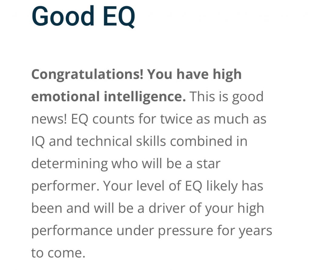 This is a snapshot of my results for the EQ test. The test mostly consisted of questions about how I handle my emotions.
