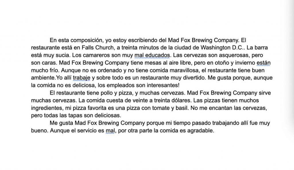 Throughout the semester, we wrote compositions in class to discuss certain topics relevant to the content of the lesson. These writing activities prepared us to write in a way which was informative to an audience and organized into sections which encouraged us to elaborate on the overall topic in greater detail. The first composition was an interview with a fellow student about recent fashion trends. I did poorly on my first attempt as I misinterpreted the topic, and worded my sentences poorly after finding myself forgetting many necessary words. I corrected this one by rereading the prompt and practicing my interpretive reading skills, ensuring I responded to what it was actually asking when submitting my corrections. For the second composition, which asked us to review a restaurant, I was better prepared based off of my previous mistakes. I familiarized myself with relevant vocabulary and ensured that I comprehended the prompt before writing the composition. I did significantly better than I did after my initial first attempt, however the issues remaining were mainly grammar mistakes, which rendered a few sentences incomprehensible. When I went about correcting the second composition, I went back and reviewed conjugations and word endings, reworking a few sentences to properly restate what I had tried to say at first. Other than a few small remaining mistakes, I successfully presented what was asked of me in the prompt through my written Spanish. Moving forward, more practice with tenses and proper endings for words, as well as consistently practicing vocabulary, will help me to improve my writing skills.
