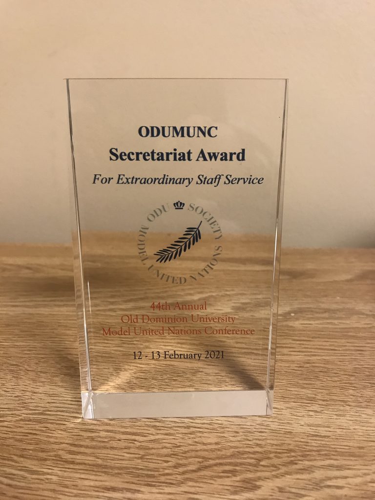 I helped staff ODUMUNC XLIV, serving as a Vice Chair, while also getting the opportunity to gain experience on all levels of the Dais, and was given the Secretariat Award for my contribution.