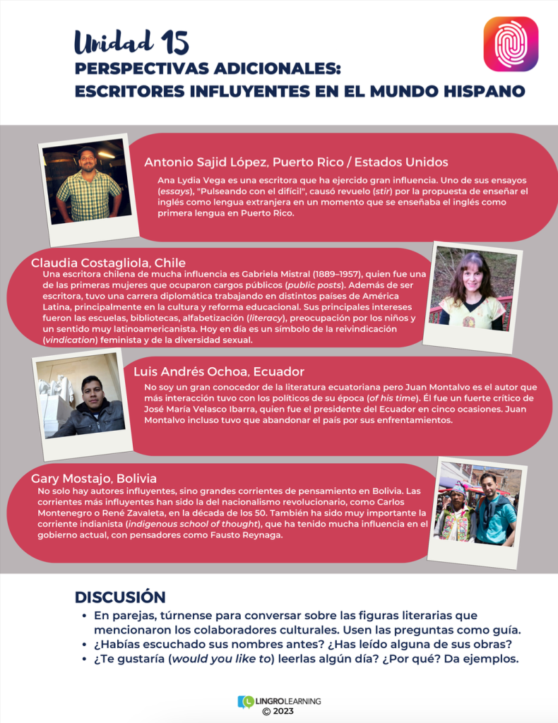 The following assignment involved reading about writers that had an impact in Spanish-speaking countries and the historical significance of their work. After gaining an understanding of how different writers inspire readers in their country, it was important to apply that knowledge by answering questions about different literary influences in Latin America.