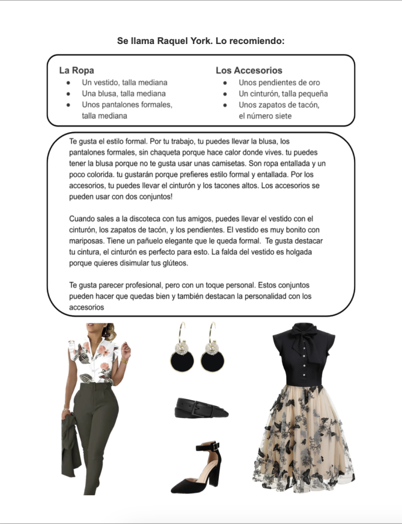 In chapter 11 we learned about fashion and how to talk about style preferences. Our project for that chapter consisted of reviewing a style quiz in Spanish for another person and recommending outfits and accessories for them.