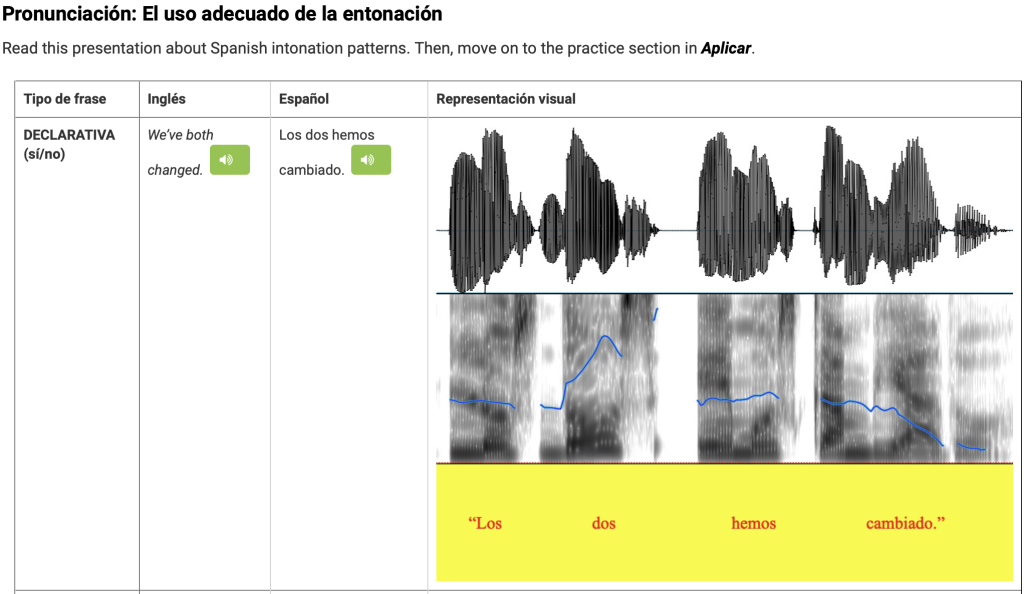 I learned how Spanish intonation patterns affect how your words are perceived. Just like in English, your tone and which words you emphasize can change the meaning of your sentence. This activity was helpful because was able to connect a visual to the audio and that helped me understand where I needed to modulate my voice during speech