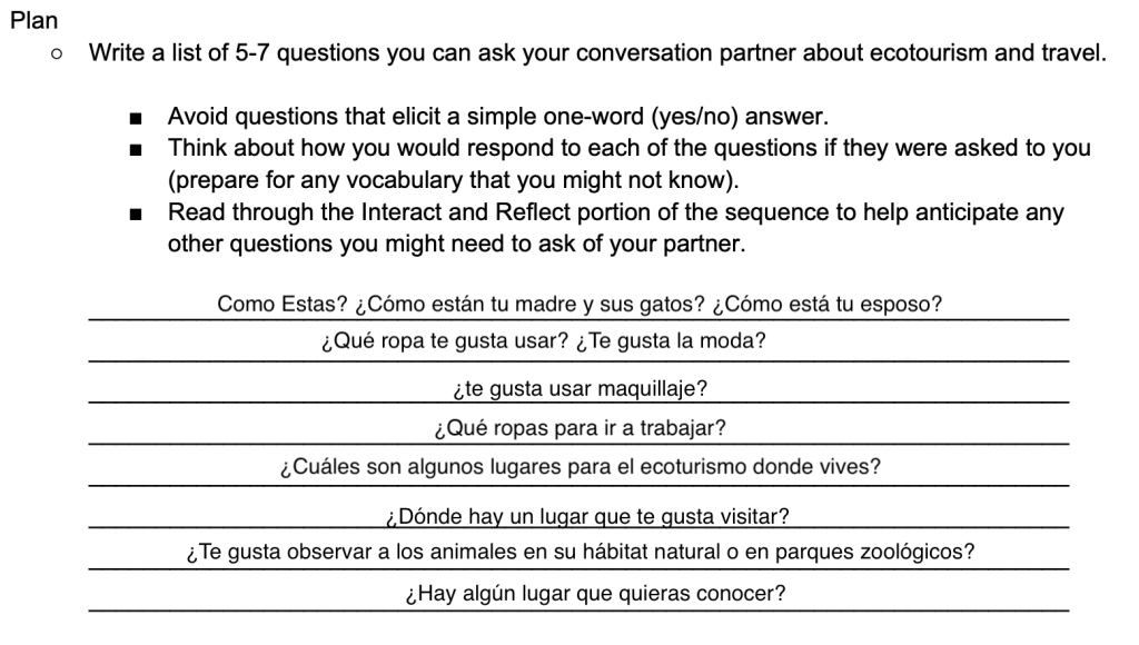 This semester we did not record any of our Spanish projects as videos but we did need to speak frequently in class and were required to respond to impromptu questions. This was different than in previous classes because there was no opportunity to prepare sentences before class, but this technique resulted in more organic, although sometimes rocky, communication. This learning style made me a more active listener and I found that by analyzing lip movement and facial expressions I was able to better understand the other speaker. By actively listening I was able to gain a better understanding of how to form sentences and use the many different tenses we learned during this semester. I was able to work on my biggest weakness, which is gender and number agreement when speaking Spanish, as well as my speech pattern.