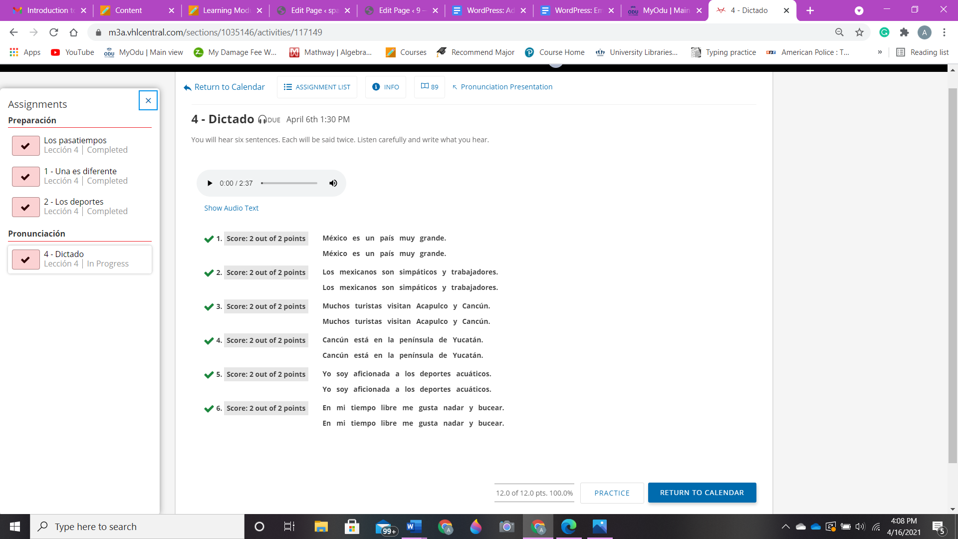 When it comes to communication activities they were mostly unplanned and allowed me to become comfortable with what I was talking about. It typically started slow but after a while, I would become more fluent.  Understanding the audio and reciting it was difficult and taught me how to really listen to what I hear and even connect dots between words I didn’t hear since it was so fast. Interviews with students and teachers did the same thing as communicating activities: made me more confident, comfortable, and fluent. I was good at interviews I guess since I had time to prepare and get it down. I learned that Spanish isn’t as hard as it looks, next time I’d be a bit more comfortable and confident initially.