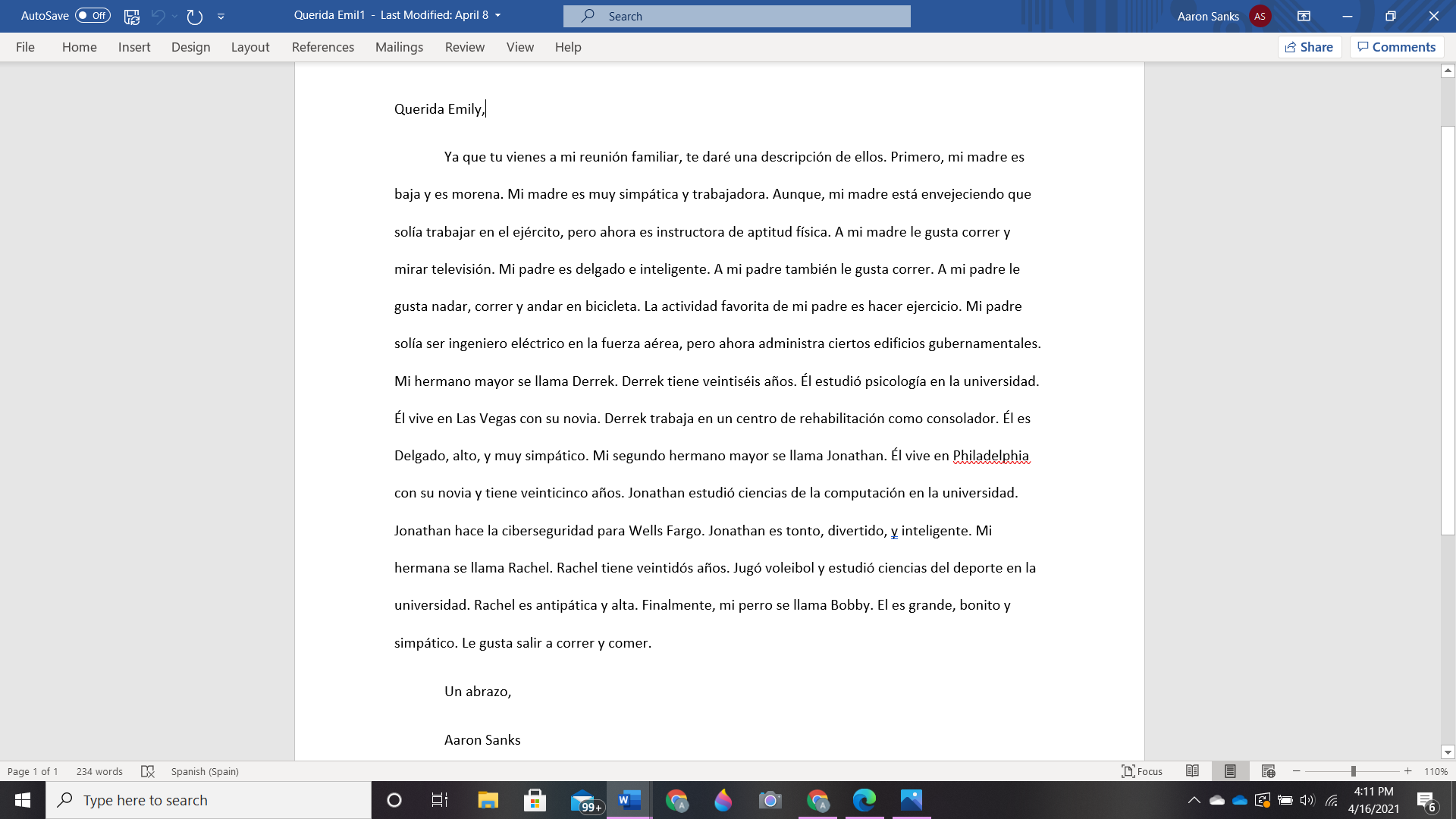 I had a presentational writing assignment earlier this semester where I had to write an email describing my family to a friend, and I read Spanish brochures and had to explain the meaning of them.