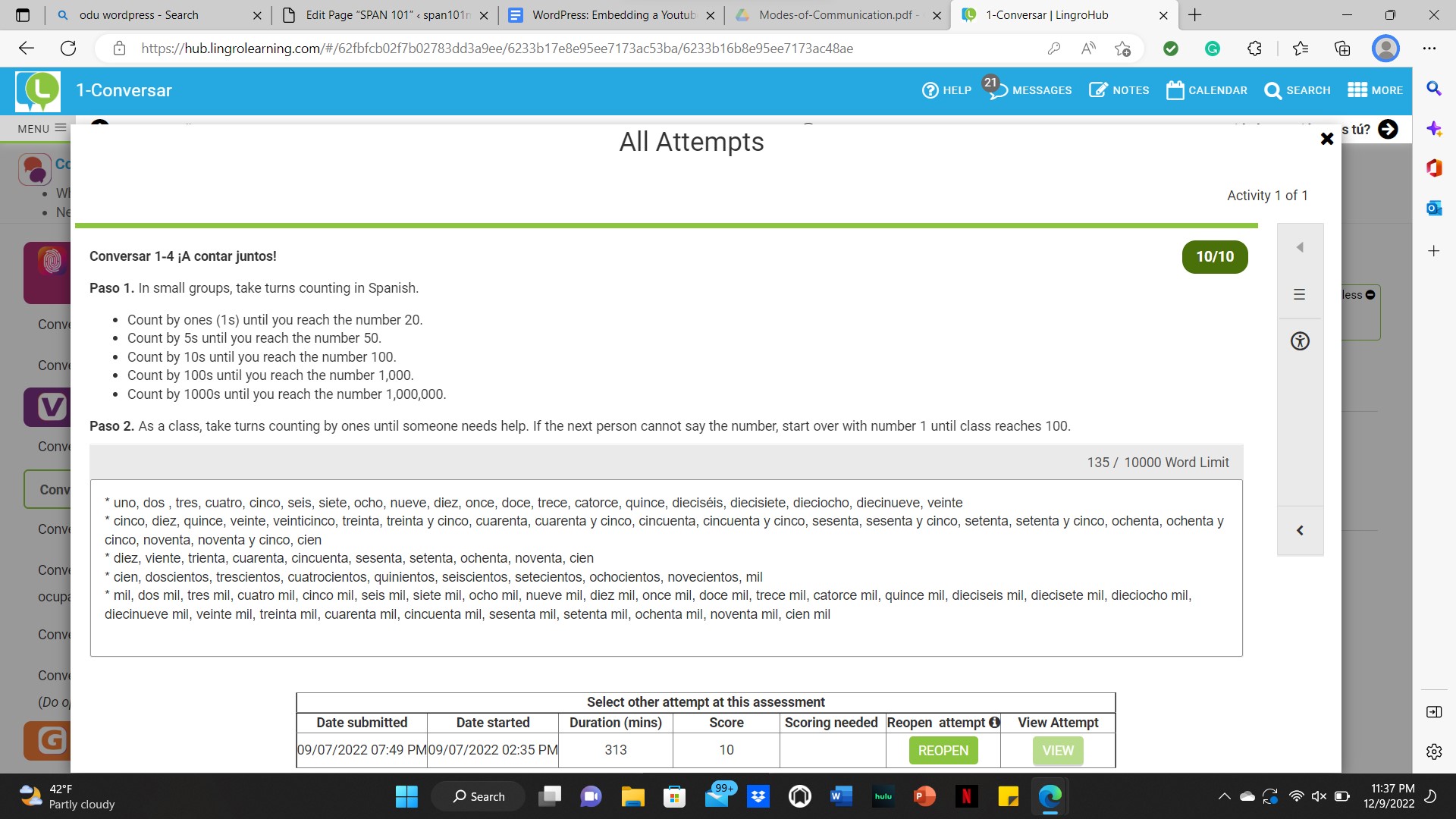 Reading is one of my problem areas with Spanish. Towards the end of the modules, there would be “fill in the blank” assignments. Those are like my kryptonite. I always get frustrated because I think that the words given could go anywhere. I think that as the semester went on I got better at these assignments. In the beginning, I would simply give up. Now I urge myself to try, even if I get the questions wrong.