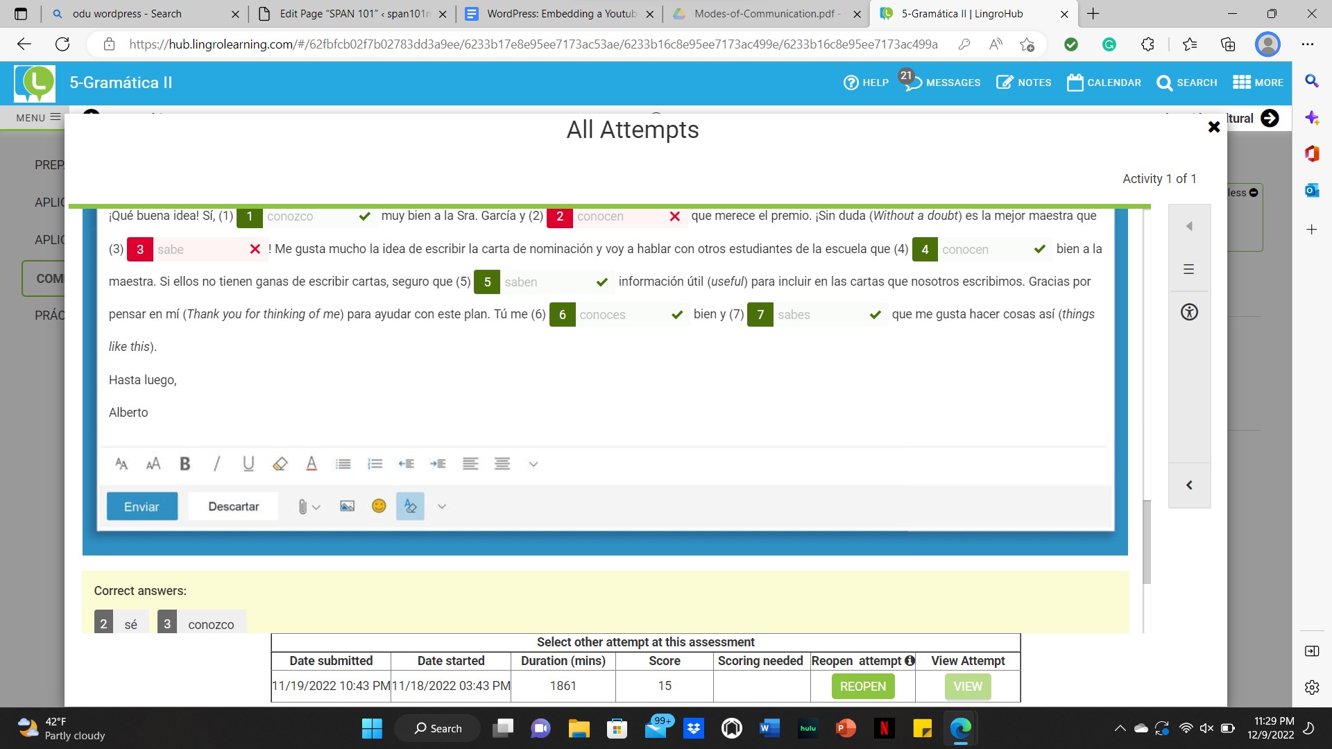 In Lingro, letters and emails are a part of the reading given in the assignments. Fill-in-the-blank assignments are used to give real-life context to how Spanish is written in certain contexts like formal or informal instances.