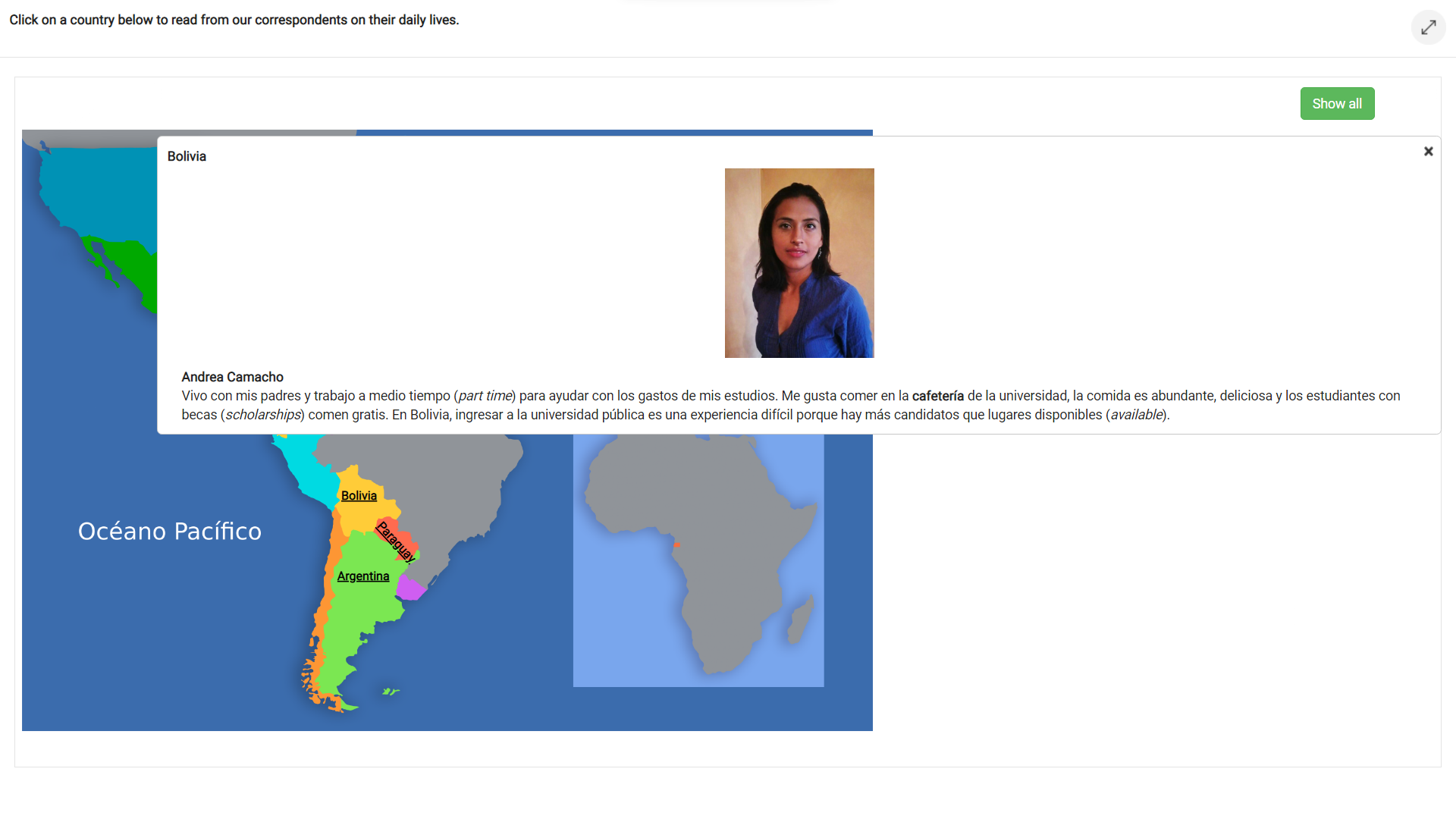 In Lingro, both assignments in class and homework online showed me many opportunities to learn about Hispanic culture. It helped me understand some of the contexts of how Spanish is used in real life as well as how people in these Hispanic countries experience their lives.