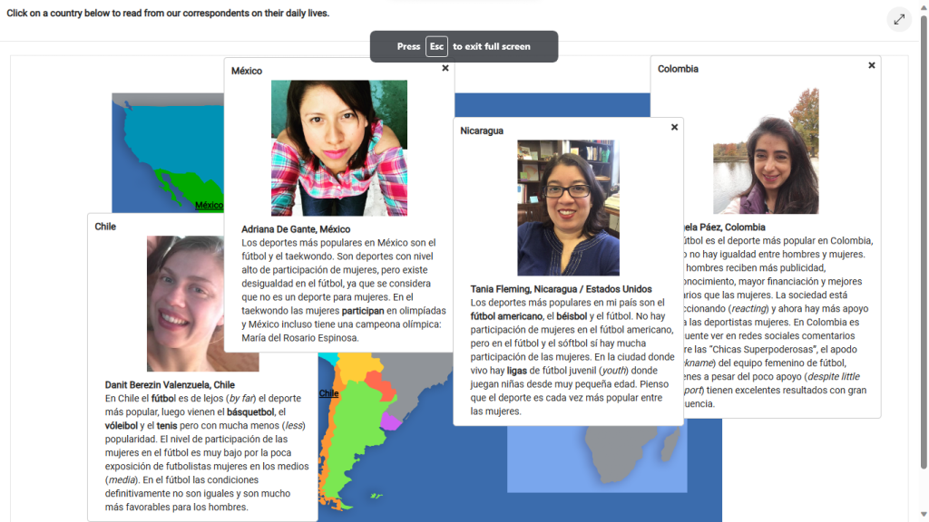 Something that helped me gain an understanding of the culture in Spanish-Speaking countries was the ‘Exploracion cultural” sections in Lingrolearning. This example shows which countries think about issues like gender inequality in sports. Since sports and gender equality often go hand and hand all over the world, it helped me gain a greater understanding of these cultural perspectives.
