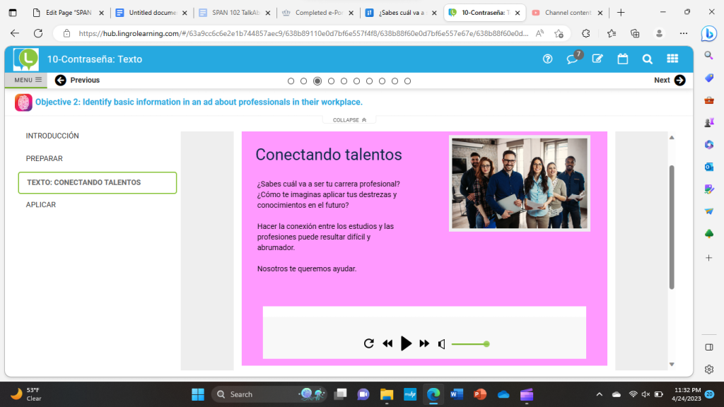 I decided to add this screenshot and combine both of the interpretive reading and listening. The screenshot shows the ‘Texto: Conectando talentos’ section from unit 10.