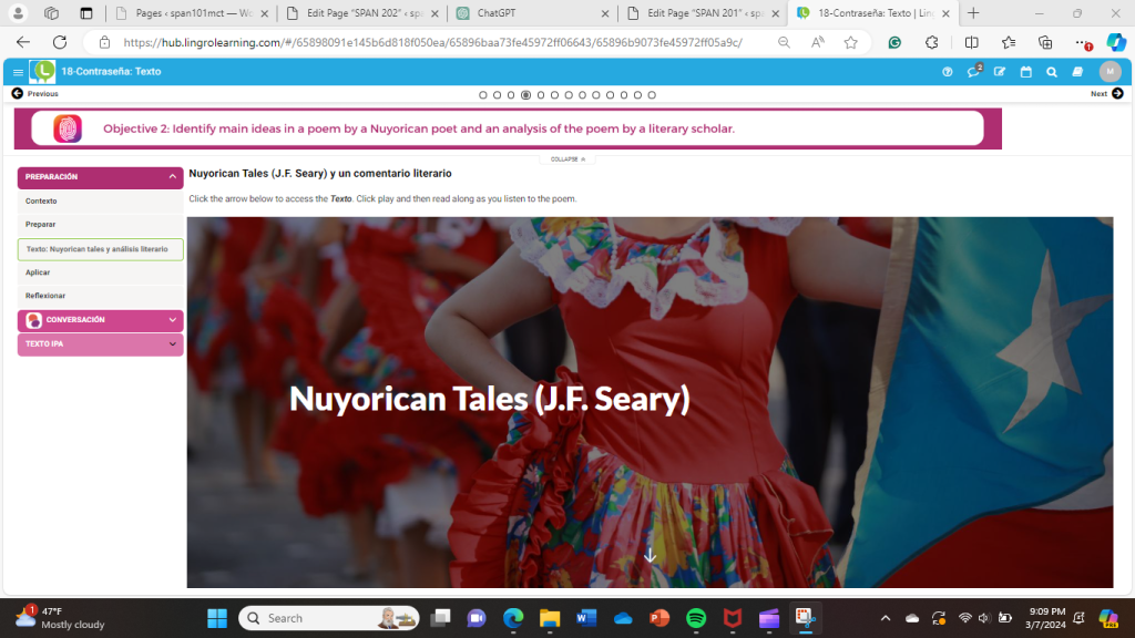 In this unit, we learned about the culture of Nuyoricans. We learned about dual-heritage Latinos through poetry and an article informing us about the author of the poem Nuyorican Tales, J.F. Seary.